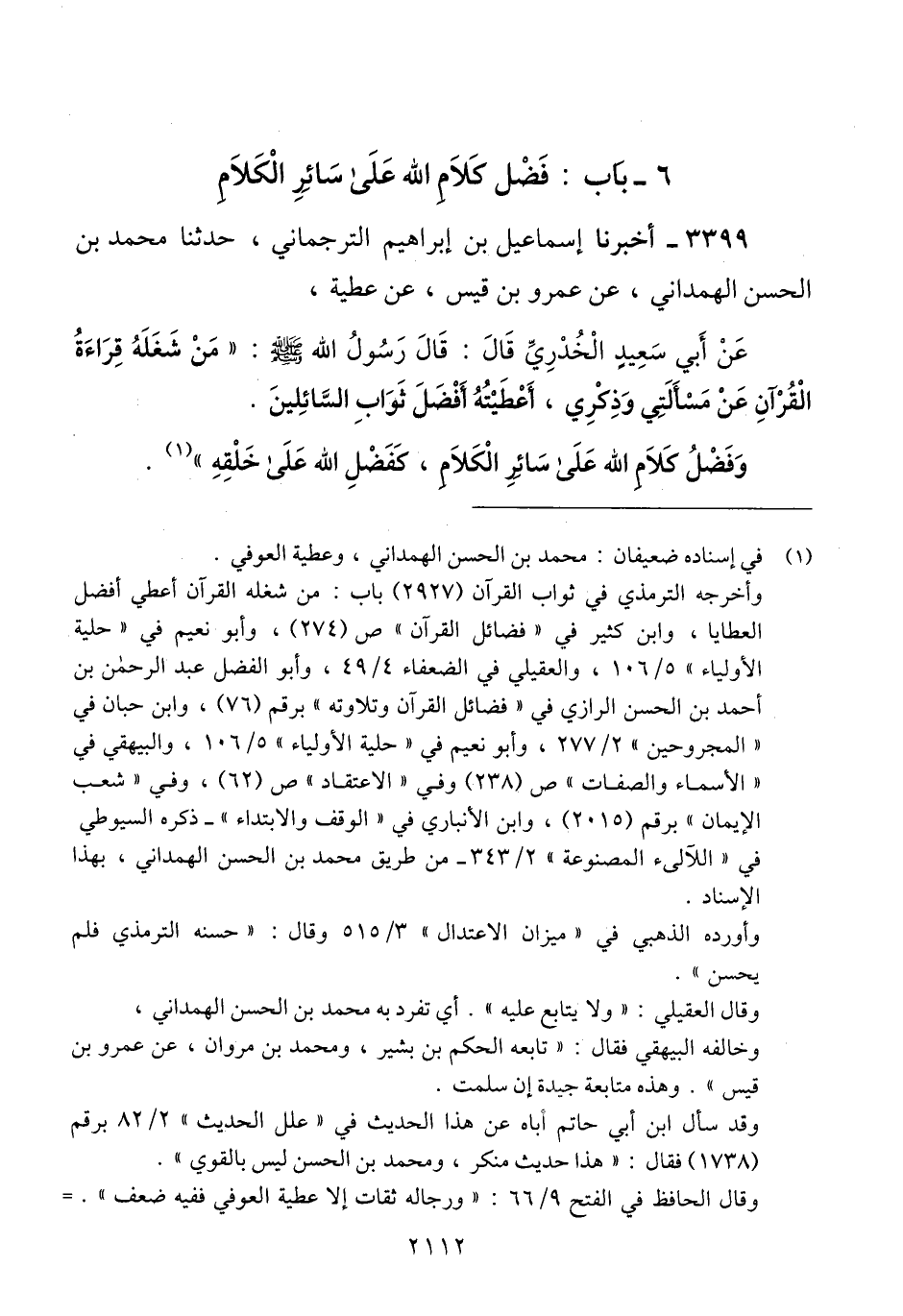 3399 - أَخْبَرَنَا إِسْمَاعِيلُ بْنُ إِبْرَاهِيمَ التَّرْجُمَانِيُّ، حَدَّثَنَا مُحَمَّدُ بْنُ الْحَسَنِ الْهَمْدَانِيُّ، عَنْ عَمْرِو بْنِ قَيْسٍ، عَنْ عَطِيَّةَ، عَنْ أَبِي سَعِيدٍ الْخُدْرِيِّ، قَالَ: قَالَ رَسُولُ اللَّهِ صَلَّى اللهُ عَلَيْهِ وَسَلَّمَ: «§مَنْ شَغَلَهُ قِرَاءَةُ الْقُرْآنِ عَنْ مَسْأَلَتِي وَذِكْرِي، أَعْطَيْتُهُ أَفْضَلَ ثَوَابِ السَّائِلِينَ. وَفَضْلُ كَلَامِ اللَّهِ عَلَى سَائِرِ الْكَلَامِ، كَفَضْلِ اللَّهِ عَلَى خَلْقِهِ» Qفي إسناده ضعيفان: محمد بن الحسن الهمداني وعطية العوفي
