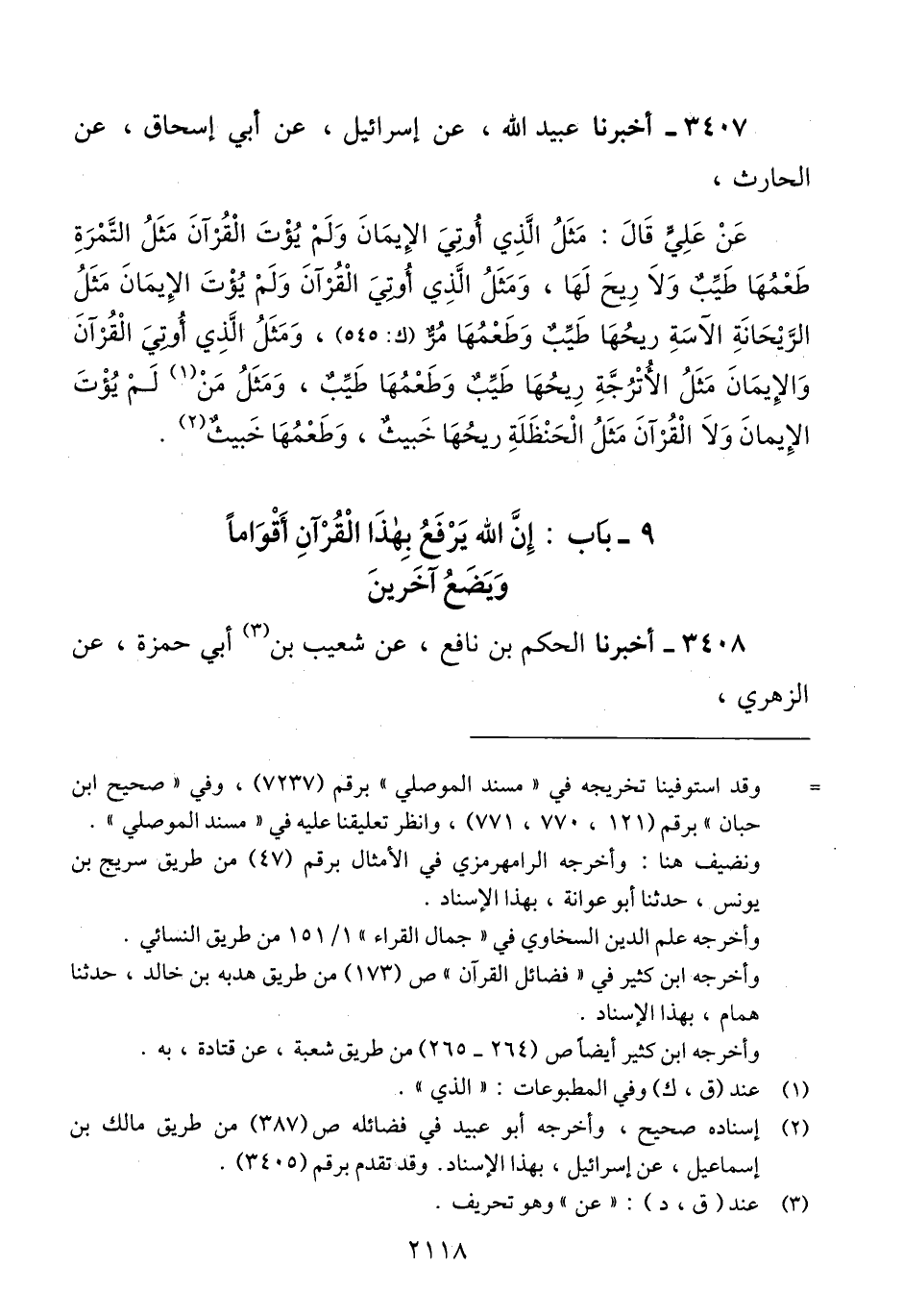 3407 - أَخْبَرَنَا عُبَيْدُ اللَّهِ، عَنْ إِسْرَائِيلَ، عَنْ أَبِي إِسْحَاقَ، عَنْ الْحَارِثِ، عَنْ عَلِيٍّ، قَالَ: «§مَثَلُ الَّذِي أُوتِيَ الْإِيمَانَ وَلَمْ يُؤْتَ الْقُرْآنَ مَثَلُ التَّمْرَةِ طَعْمُهَا طَيِّبٌ وَلَا رِيحَ لَهَا، وَمَثَلُ الَّذِي أُوتِيَ الْقُرْآنَ وَلَمْ يُؤْتَ الْإِيمَانَ مَثَلُ الرَّيْحَانَةِ الْآسَةِ رِيحُهَا طَيِّبٌ، وَطَعْمُهَا مُرٌّ، وَمَثَلُ الَّذِي أُوتِيَ الْقُرْآنَ وَالْإِيمَانَ مَثَلُ الْأُتْرُجَّةِ رِيحُهَا طَيِّبٌ وَطَعْمُهَا طَيِّبٌ، وَمَثَلُ مَنْ لَمْ يُؤْتَ الْإِيمَانَ وَلَا الْقُرْآنَ مَثَلُ الْحَنْظَلَةِ رِيحُهَا خَبِيثٌ، وَطَعْمُهَا خَبِيثٌ» Qإسناده صحيح