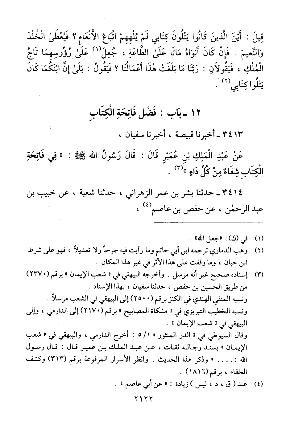 3413 - أَخْبَرَنَا قَبِيصَةُ، أَخْبَرَنَا سُفْيَانُ، عَنْ عَبْدِ الْمَلِكِ بْنِ عُمَيْرٍ، قَالَ: قَالَ رَسُولُ اللَّهِ صَلَّى اللهُ عَلَيْهِ وَسَلَّمَ: «§فِي فَاتِحَةِ الْكِتَابِ شِفَاءٌ مِنْ كُلِّ دَاءٍ» Qإسناده صحيح غير أنه مرسل