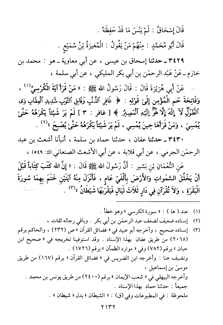 3430 - حَدَّثَنَا عَفَّانُ، حَدَّثَنَا حَمَّادُ بْنُ سَلَمَةَ، أَنْبَأَنَا أَشْعَثُ بْنُ عَبْدِ الرَّحْمَنِ الْجَرْمِيُّ، عَنْ أَبِي قِلَابَةَ، عَنْ أَبِي الْأَشْعَثِ الصَّنْعَانِيِّ، عَنْ النُّعْمَانِ بْنِ بَشِيرٍ، أَنَّ رَسُولَ اللَّهِ صَلَّى اللهُ عَلَيْهِ وَسَلَّمَ قَالَ: «§إِنَّ اللَّهَ كَتَبَ كِتَابًا قَبْلَ أَنْ يَخْلُقَ السَّمَوَاتِ وَالْأَرْضَ بِأَلْفَيْ عَامٍ، فَأَنْزَلَ مِنْهُ آيَتَيْنِ خَتَمَ بِهِمَا سُورَةَ الْبَقَرَةِ، وَلَا تُقْرَآنِ فِي دَارٍ ثَلَاثَ لَيَالٍ فَيَقْرَبُهَا شَيْطَانٌ» Qإسناده صحيح