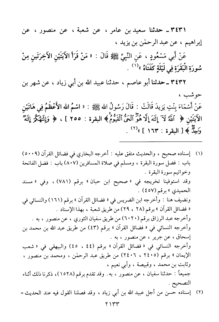 3431 - حَدَّثَنَا سَعِيدُ بْنُ عَامِرٍ، عَنْ شُعْبَةَ، عَنْ مَنْصُورٍ، عَنْ إِبْرَاهِيمَ، عَنْ عَبْدِ الرَّحْمَنِ بْنِ يَزِيدَ، عَنْ أَبِي مَسْعُودٍ، عَنِ النَّبِيِّ صَلَّى اللهُ عَلَيْهِ وَسَلَّمَ قَالَ: «§مَنْ قَرَأَ الْآيَتَيْنِ الْآخِرَتَيْنِ مِنْ سُورَةِ الْبَقَرَةِ فِي لَيْلَةٍ كَفَتَاهُ» Qإسناده صحيح والحديث متفق عليه