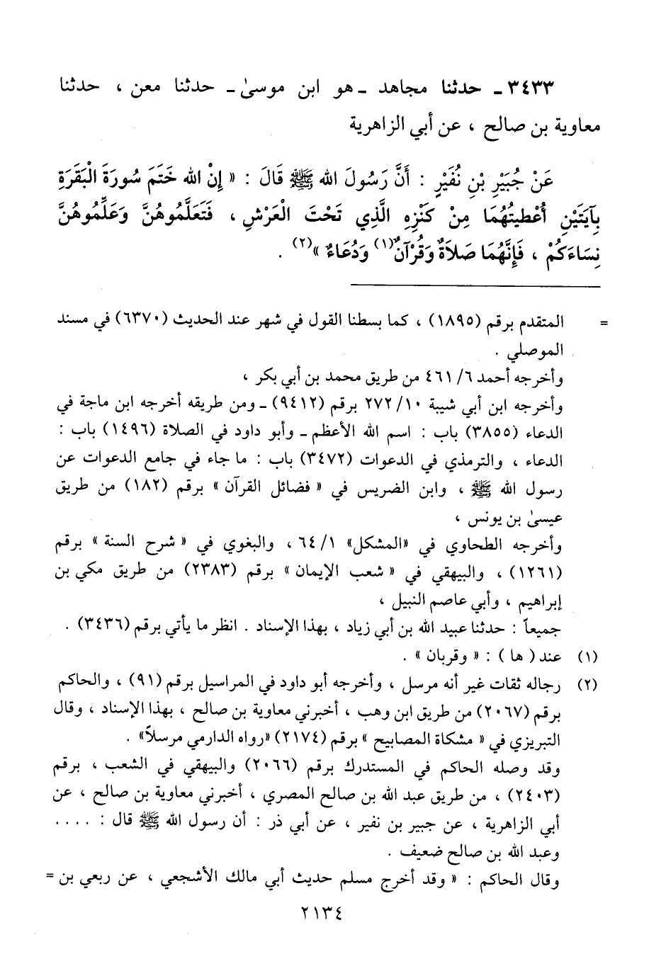 3433 - حَدَّثَنَا مُجَاهِدٌ هُوَ ابْنُ مُوسَى، حَدَّثَنَا مَعْنٌ، حَدَّثَنَا مُعَاوِيَةُ بْنُ صَالِحٍ، عَنْ أَبِي الزَّاهِرِيَّةِ، عَنْ جُبَيْرِ بْنِ نُفَيْرٍ، أَنَّ رَسُولَ اللَّهِ صَلَّى اللهُ عَلَيْهِ وَسَلَّمَ قَالَ: «§إِنَّ اللَّهَ خَتَمَ سُورَةَ الْبَقَرَةِ بِآيَتَيْنِ أُعْطِيتُهُمَا مِنْ كَنْزِهِ الَّذِي تَحْتَ الْعَرْشِ، فَتَعَلَّمُوهُنَّ وَعَلِّمُوهُنَّ نِسَاءَكُمْ، فَإِنَّهُمَا صَلَاةٌ وَقُرْآنٌ وَدُعَاءٌ» Qرجاله ثقات غير أنه مرسل