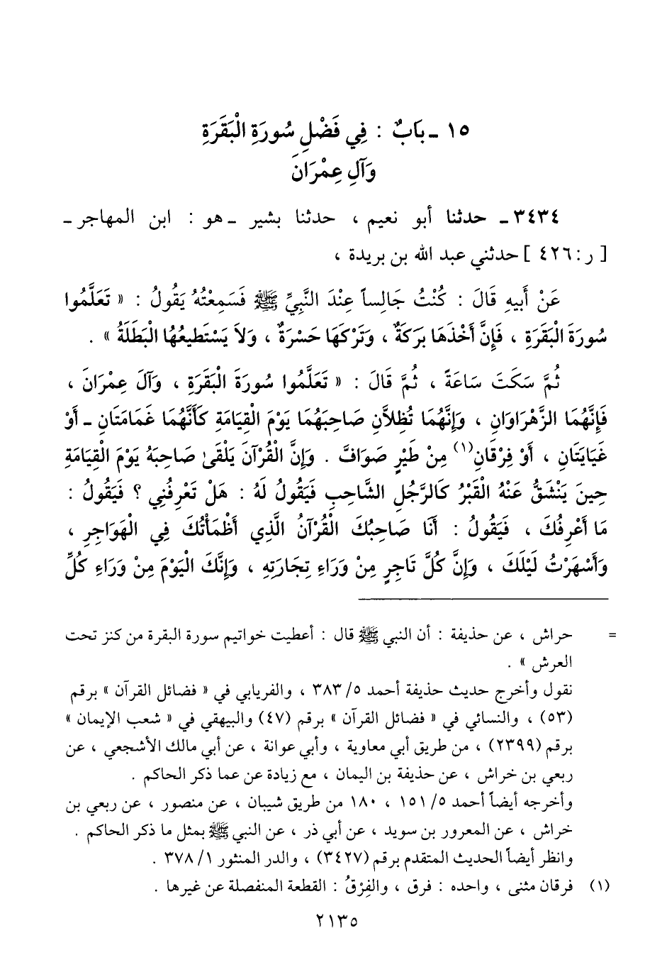 3434 - حَدَّثَنَا أَبُو نُعَيْمٍ، حَدَّثَنَا بَشِيرٌ هُوَ ابْنُ الْمُهَاجِرِ، حَدَّثَنِي عَبْدُ اللَّهِ بْنُ بُرَيْدَةَ، عَنْ أَبِيهِ، قَالَ: كُنْتُ جَالِسًا عِنْدَ النَّبِيِّ صَلَّى اللهُ عَلَيْهِ وَسَلَّمَ فَسَمِعْتُهُ يَقُولُ: «§تَعَلَّمُوا سُورَةَ الْبَقَرَةِ، فَإِنَّ أَخْذَهَا بَرَكَةٌ، وَتَرْكَهَا حَسْرَةٌ، وَلَا يَسْتَطِيعُهَا الْبَطَلَةُ». ثُمَّ سَكَتَ سَاعَةً، ثُمَّ قَالَ: " تَعَلَّمُوا سُورَةَ الْبَقَرَةِ، وَآلِ عِمْرَانَ، فَإِنَّهُمَا الزَّهْرَاوَانِ، وَإِنَّهُمَا تُظِلَّانِ صَاحِبَهُمَا يَوْمَ الْقِيَامَةِ كَأَنَّهُمَا غَمَامَتَانِ أَوْ غَيَايَتَانِ، أَوْ فِرْقَانِ مِنْ طَيْرٍ صَوَافَّ. وَإِنَّ الْقُرْآنَ يَلْقَى صَاحِبَهُ يَوْمَ الْقِيَامَةِ حِينَ يَنْشَقُّ عَنْهُ الْقَبْرُ كَالرَّجُلِ الشَّاحِبِ فَيَقُولُ لَهُ: هَلْ تَعْرِفُنِي؟ فَيَقُولُ: مَا أَعْرِفُكَ، فَيَقُولُ: أَنَا صَاحِبُكَ الْقُرْآنُ الَّذِي أَظْمَأْتُكَ فِي الْهَوَاجِرِ، وَأَسْهَرْتُ لَيْلَكَ، وَإِنَّ كُلَّ تَاجِرٍ مِنْ وَرَاءِ تِجَارَتِهِ، وَإِنَّكَ الْيَوْمَ مِنْ وَرَاءِ كُلِّ -[2136]- تِجَارَةٍ، فَيُعْطَى الْمُلْكَ بِيَمِينِهِ، وَالْخُلْدَ بِشِمَالِهِ، وَيُوضَعُ عَلَى رَأْسِهِ تَاجُ الْوَقَارِ، وَيُكْسَى وَالِدَاهُ حُلَّتَيْنِ لَا يُقَوَّمُ لَهُمَا الدُّنْيَا، فَيَقُولَانِ: بِمَ كُسِينَا هَذَا؟ فيُقَالُ لَهُمَا: بِأَخْذِ وَلَدِكُمَا الْقُرْآنَ. ثُمَّ يُقَالُ لَهُ: اقْرَأْ وَاصْعَدْ فِي دَرَجِ الْجَنَّةِ وَغُرَفِهَا، فَهُوَ فِي صُعُودٍ مَا دَامَ يَقْرَأُ هَذًّا كَانَ أَوْ تَرْتِيلًا "Qإسناده حسن من أجل بشير بن المهاجر