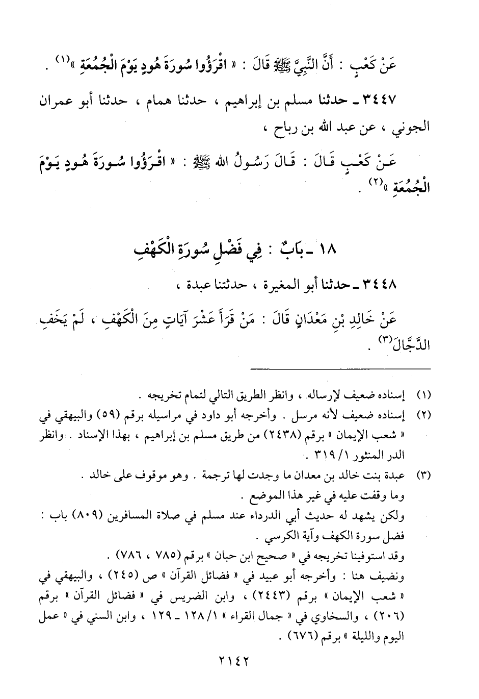 3447 - حَدَّثَنَا مُسْلِمُ بْنُ إِبْرَاهِيمَ، حَدَّثَنَا هَمَّامٌ، حَدَّثَنَا أَبُو عِمْرَانَ الْجَوْنِيُّ، عَنْ عَبْدِ اللَّهِ بْنِ رَبَاحٍ، عَنْ كَعْبٍ، قَالَ: قَالَ رَسُولُ اللَّهِ صَلَّى اللهُ عَلَيْهِ وَسَلَّمَ: «§اقْرَءُوا سُورَةَ هُودٍ يَوْمَ الْجُمُعَةِ» Qإسناده ضعيف لأنه مرسل