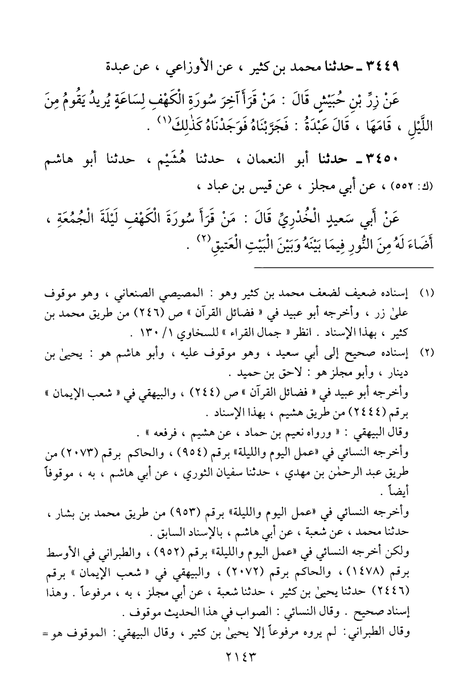 3450 - حَدَّثَنَا أَبُو النُّعْمَانِ، حَدَّثَنَا هُشَيْمٌ، حَدَّثَنَا أَبُو هَاشِمٍ، عَنْ أَبِي مِجْلَزٍ، عَنْ قَيْسِ بْنِ عُبَادٍ، عَنْ أَبِي سَعِيدٍ الْخُدْرِيِّ، قَالَ: «§مَنْ قَرَأَ سُورَةَ الْكَهْفِ لَيْلَةَ الْجُمُعَةِ، أَضَاءَ لَهُ مِنَ النُّورِ فِيمَا بَيْنَهُ وَبَيْنَ الْبَيْتِ الْعَتِيقِ» Qإسناده صحيح إلى أبي سعيد وهو موقوف عليه