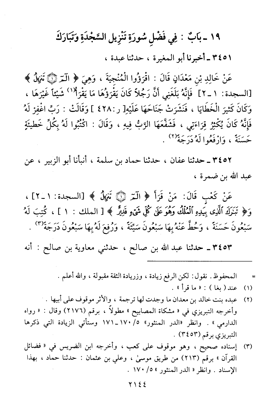 3452 - حَدَّثَنَا عَفَّانُ، حَدَّثَنَا حَمَّادُ بْنُ سَلَمَةَ، أَنْبَأَنَا أَبُو الزُّبَيْرِ، عَنْ عَبْدِ اللَّهِ بْنِ ضَمْرَةَ، عَنْ كَعْبٍ، قَالَ: «§مَنْ قَرَأَ تَنْزِيلُ السَّجْدَةَ، وََ تَبَارَكَ الَّذِي بِيَدِهِ الْمُلْكُ وَهُوَ عَلَى كُلِّ شَيْءٍ قَدِيرٌ، كُتِبَ لَهُ سَبْعُونَ حَسَنَةً، وَحُطَّ عَنْهُ بِهَا سَبْعُونَ سَيِّئَةً، وَرُفِعَ لَهُ بِهَا سَبْعُونَ دَرَجَةً» Qإسناده صحيح وهو موقوف على كعب