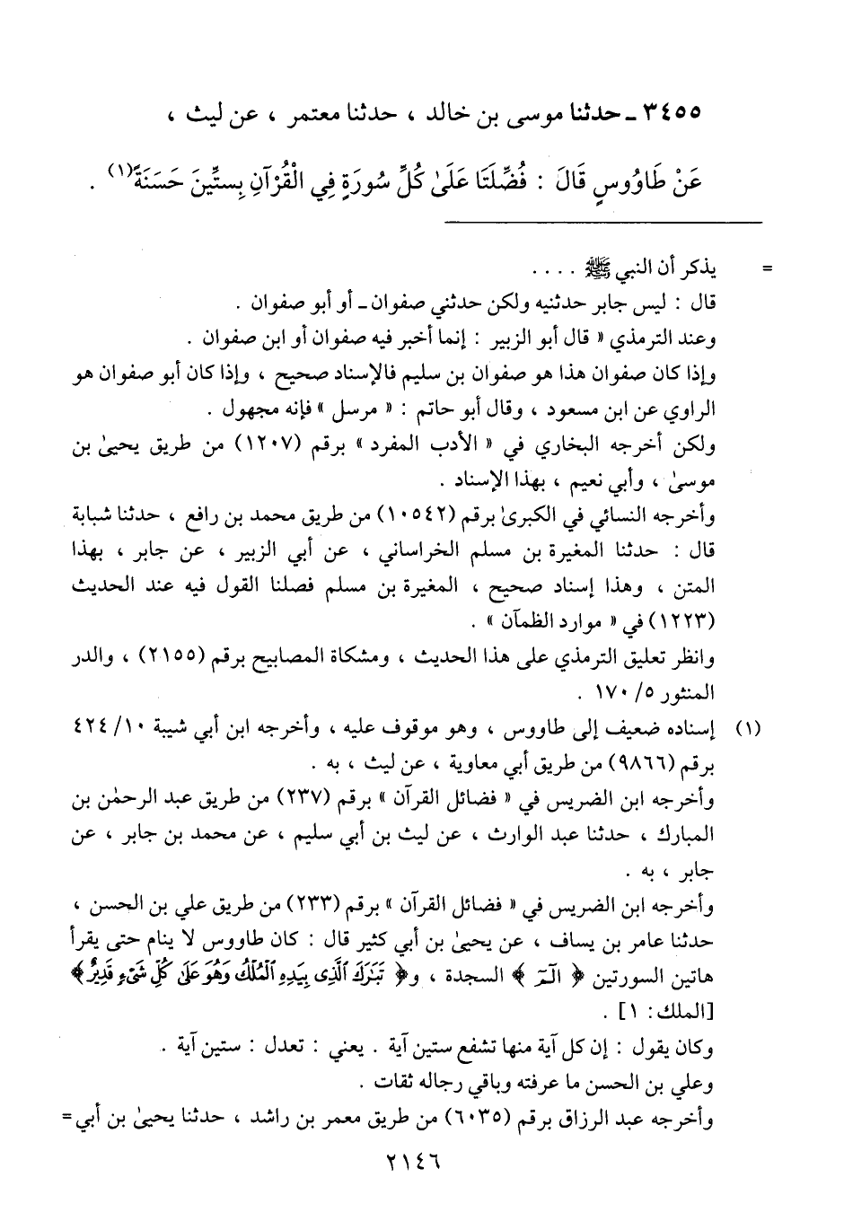 3455 - حَدَّثَنَا مُوسَى بْنُ خَالِدٍ، حَدَّثَنَا مُعْتَمِرٌ، عَنْ لَيْثٍ، عَنْ طَاوُسٍ، قَالَ: «§فُضِّلَتَا عَلَى كُلِّ سُورَةٍ فِي الْقُرْآنِ بِسِتِّينَ حَسَنَةً» Qإسناده ضعيف إلى طاووس وهو موقوف عليه