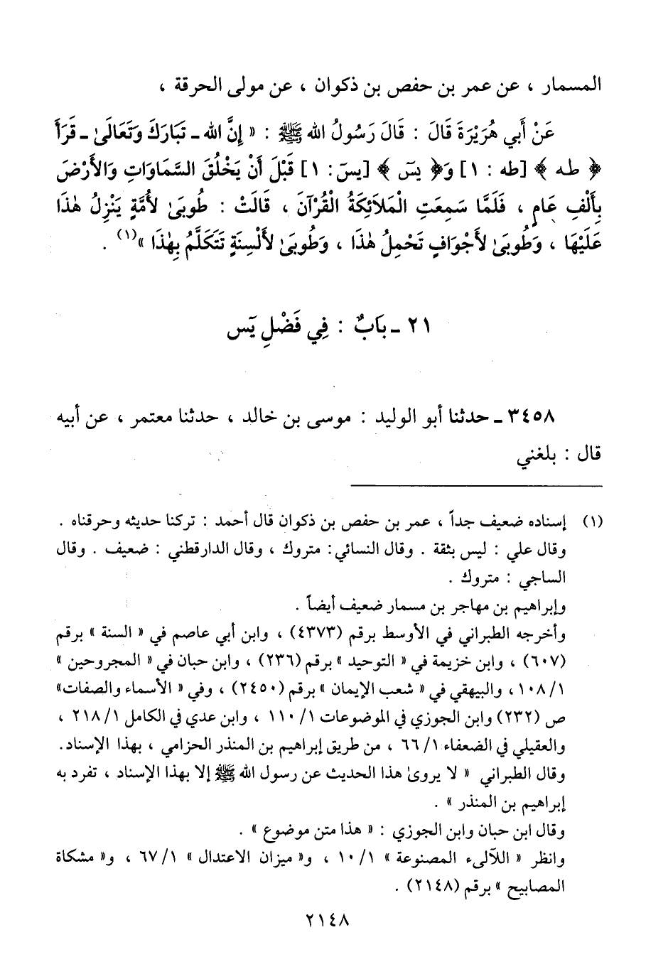 3458 - حَدَّثَنَا أَبُو الْوَلِيدِ مُوسَى بْنُ خَالِدٍ، حَدَّثَنَا مُعْتَمِرٌ، عَنْ أَبِيهِ، قَالَ: بَلَغَنِي -[2149]- عَنْ الْحَسَنِ، قَالَ: «§مَنْ قَرَأَ يس فِي لَيْلَةٍ ابْتِغَاءَ وَجْهِ اللَّهِ أَوْ مَرْضَاةِ اللَّهِ، غُفِرَ لَهُ» وَقَالَ: «بَلَغَنِي أَنَّهَا تَعْدِلُ الْقُرْآنَ كُلَّهُ» Qإسناده ضعيف لانقطاعه وهو موقوف على الحسن