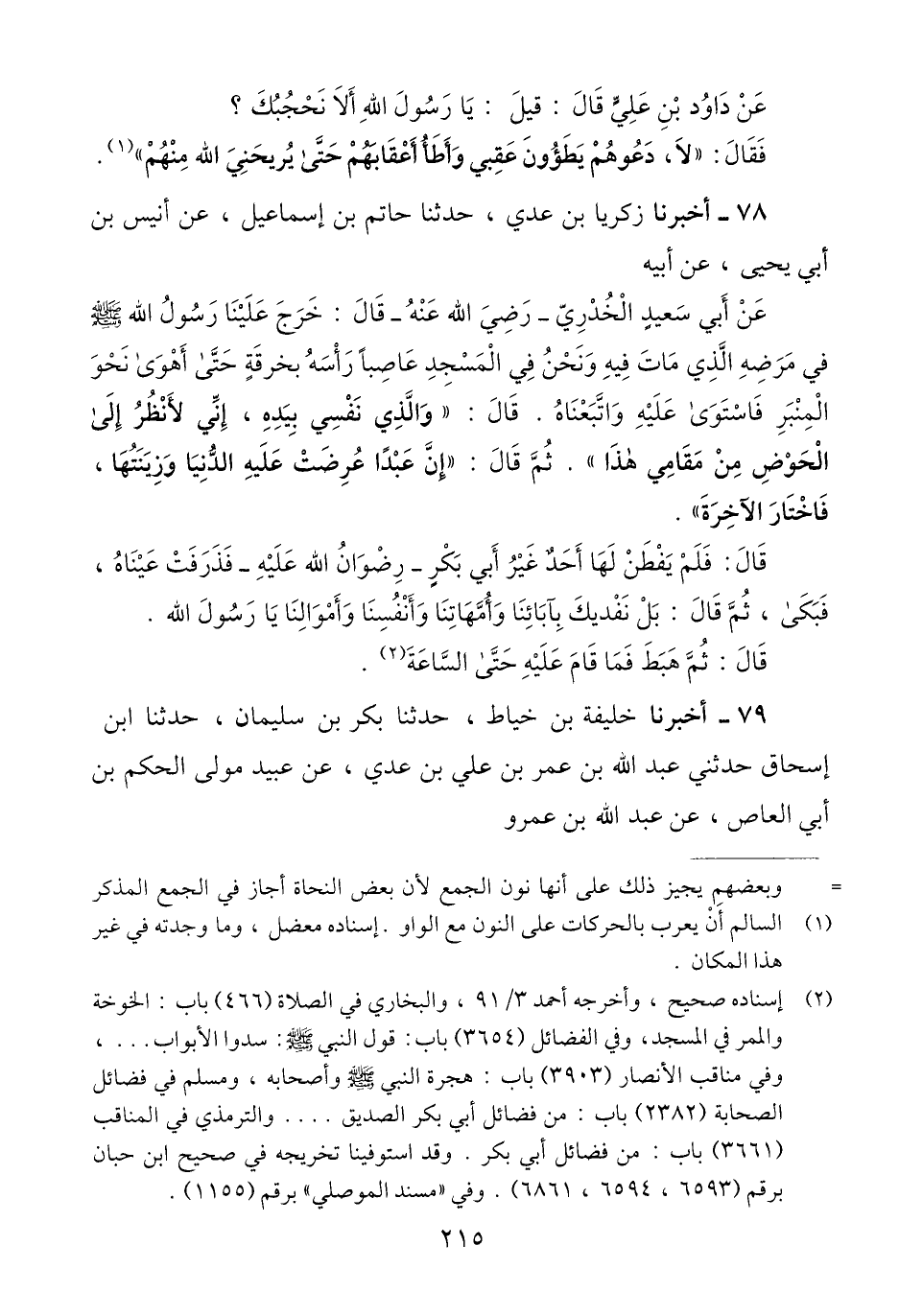 78 - أَخْبَرَنَا زَكَرِيَّا بْنُ عَدِيٍّ، حَدَّثَنَا حَاتِمُ بْنُ إِسْمَاعِيلَ، عَنْ أُنَيْسِ بْنِ أَبِي يَحْيَى، عَنْ أَبِيهِ، عَنْ أَبِي سَعِيدٍ الْخُدْرِيِّ رَضِيَ اللَّهُ عَنْهُ، قَالَ: خَرَجَ عَلَيْنَا رَسُولُ اللَّهِ صَلَّى اللهُ عَلَيْهِ وَسَلَّمَ فِي مَرَضِهِ الَّذِي مَاتَ فِيهِ وَنَحْنُ فِي الْمَسْجِدِ عَاصِبًا رَأْسَهُ بِخِرْقَةٍ حَتَّى أَهْوَى نَحْوَ الْمِنْبَرِ فَاسْتَوَى عَلَيْهِ وَاتَّبَعْنَاهُ، قَالَ: «وَالَّذِي نَفْسِي بِيَدِهِ، §إِنِّي لَأَنْظُرُ إِلَى الْحَوْضِ مِنْ مَقَامِي هَذَا»، ثُمَّ قَالَ: «إِنَّ عَبْدًا عُرِضَتْ عَلَيْهِ الدُّنْيَا وَزِينَتُهَا، فَاخْتَارَ الْآخِرَةَ»، قَالَ: فَلَمْ يَفْطِنْ لَهَا أَحَدٌ غَيْرُ أَبِي بَكْرٍ رِضْوَانُ اللَّهِ عَلَيْهِ فَذَرَفَتْ عَيْنَاهُ، فَبَكَى، ثُمَّ قَالَ: بَلْ نَفْدِيكَ بِآبَائِنَا وَأُمَّهَاتِنَا وَأَنْفُسِنَا وَأَمْوَالِنَا يَا رَسُولَ اللَّهِ، قَالَ: ثُمَّ هَبَطَ فَمَا قَامَ عَلَيْهِ حَتَّى السَّاعَةِQإسناده صحيح