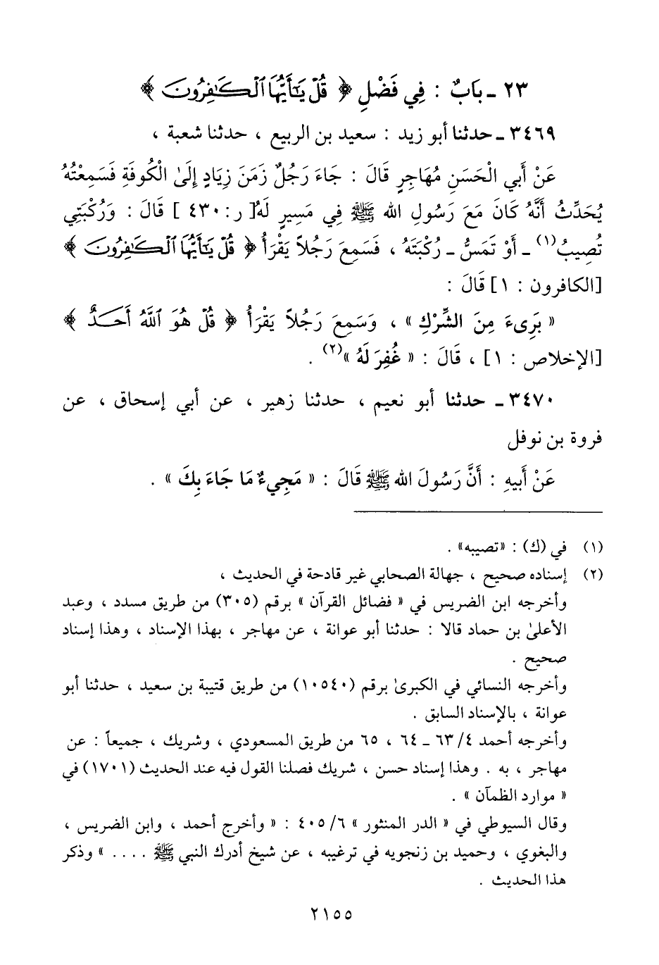 3469 - حَدَّثَنَا أَبُو زَيْدٍ سَعِيدُ بْنُ الرَّبِيعِ، حَدَّثَنَا شُعْبَةُ، عَنْ أَبِي الْحَسَنِ مُهَاجِرٍ، قَالَ: جَاءَ رَجُلٌ، زَمَنَ زِيَادٍ إِلَى الْكُوفَةِ فَسَمِعْتُهُ يُحَدِّثُ أَنَّهُ كَانَ مَعَ رَسُولِ اللَّهِ صَلَّى اللهُ عَلَيْهِ وَسَلَّمَ فِي مَسِيرٍ لَهُ قَالَ: وَرُكْبَتِي تُصِيبُ - أَوْ تَمَسُّ - رُكْبَتَهُ، فَسَمِعَ رَجُلًا يَقْرَأُ قُلْ يَا أَيُّهَا الْكَافِرُونَ قَالَ: «§بَرِئَ مِنَ الشِّرْكِ» وَسَمِعَ رَجُلًا يَقْرَأُ قُلْ هُوَ اللَّهُ أَحَدٌ، قَالَ: «غُفِرَ لَهُ» Qإسناده صحيح جهالة الصحابي غير قادحة في الحديث