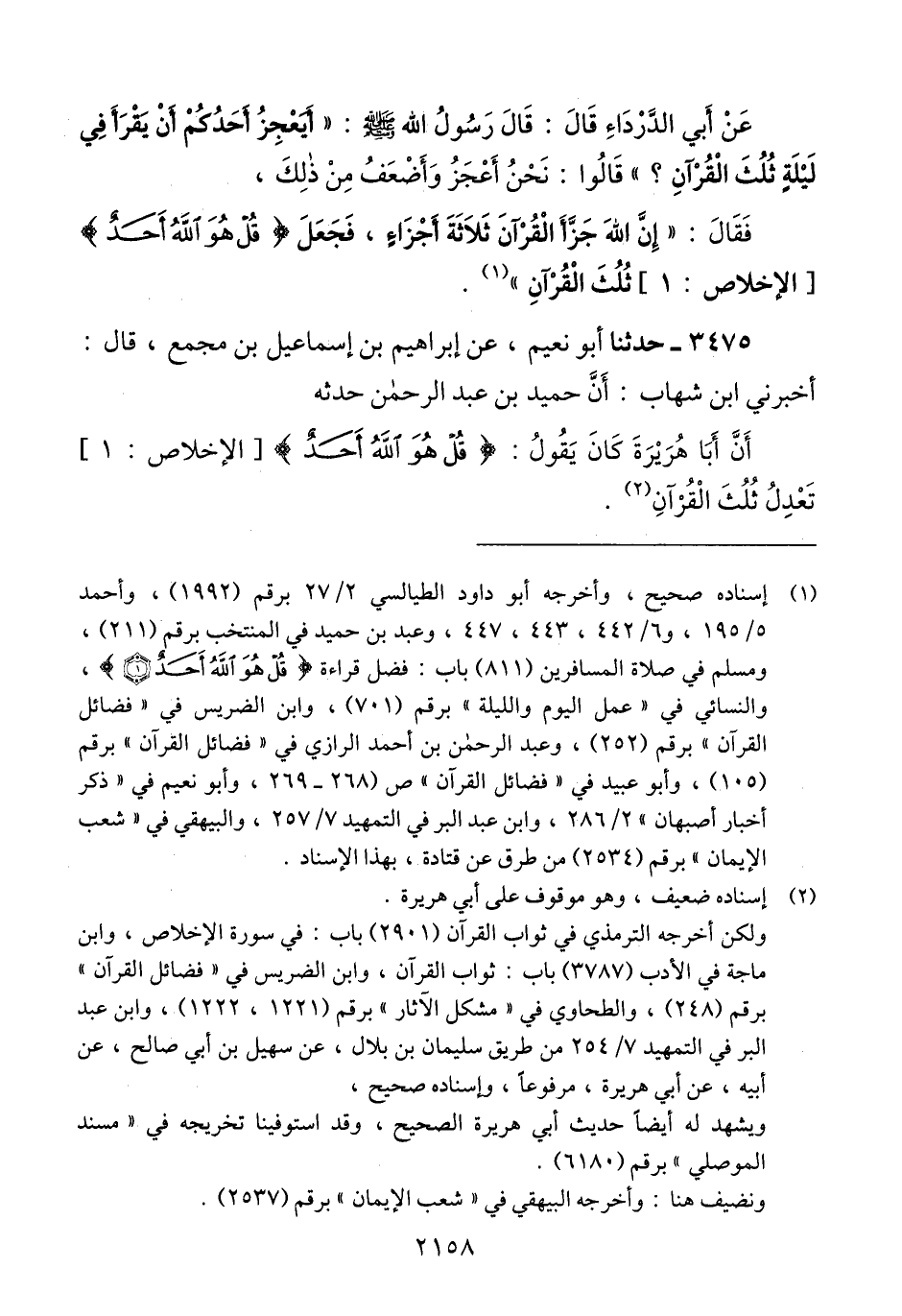 3475 - حَدَّثَنَا أَبُو نُعَيْمٍ، عَنْ إِبْرَاهِيمَ بْنِ إِسْمَاعِيلَ بْنِ مُجَمِّعٍ، قَالَ: أَخْبَرَنِي ابْنُ شِهَابٍ، أَنَّ حُمَيْدَ بْنَ عَبْدِ الرَّحْمَنِ، حَدَّثَهُ، أَنَّ أَبَا هُرَيْرَةَ، كَانَ يَقُولُ: «§قُلْ هُوَ اللَّهُ أَحَدٌ تَعْدِلُ ثُلُثَ الْقُرْآنِ» Qإسناده ضعيف وهو موقوف على أبي هريرة