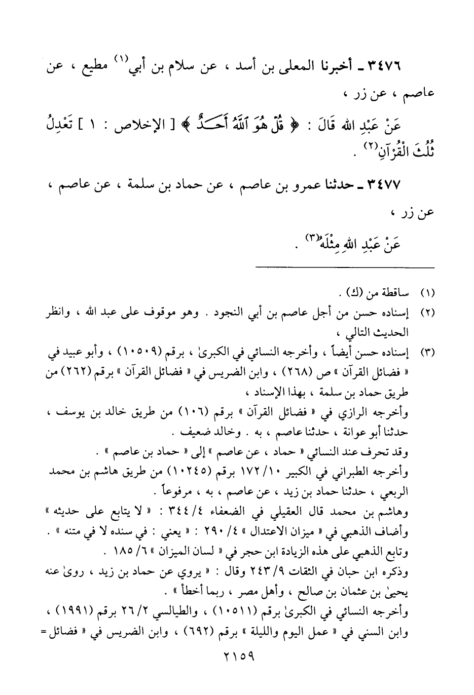 3476 - أَخْبَرَنَا الْمُعَلَّى بْنُ أَسَدٍ، عَنْ سَلَّامِ بْنِ أَبِي مُطِيعٍ، عَنْ عَاصِمٍ، عَنْ زِرٍّ، عَنْ عَبْدِ اللَّهِ، قَالَ: «§قُلْ هُوَ اللَّهُ أَحَدٌ تَعْدِلُ ثُلُثَ الْقُرْآنِ» Qإسناده حسن من أجل عاصم بن أبي النجود. وهو موقوف على عبد الله
