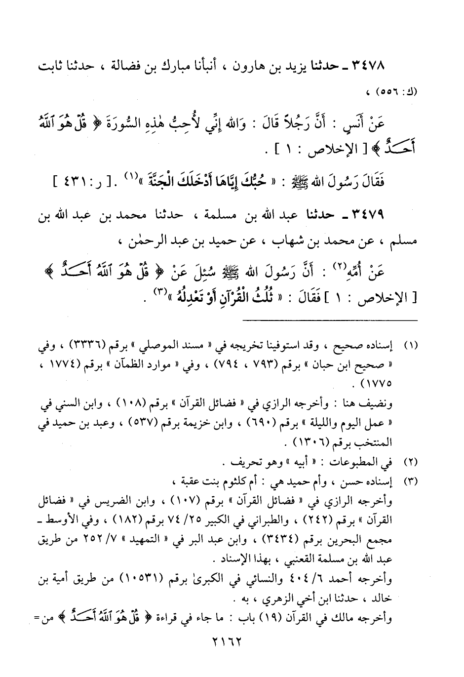 3478 - حَدَّثَنَا يَزِيدُ بْنُ هَارُونَ، أَنْبَأَنَا مُبَارَكُ بْنُ فَضَالَةَ، حَدَّثَنَا ثَابِتٌ، عَنْ أَنَسٍ، أَنَّ رَجُلًا قَالَ: وَاللَّهِ إِنِّي لَأُحِبُّ هَذِهِ السُّورَةَ قُلْ هُوَ اللَّهُ أَحَدٌ. فَقَالَ رَسُولُ اللَّهِ صَلَّى اللهُ عَلَيْهِ وَسَلَّمَ: «§حُبُّكَ إِيَّاهَا أَدْخَلَكَ الْجَنَّةَ» Qإسناده صحيح