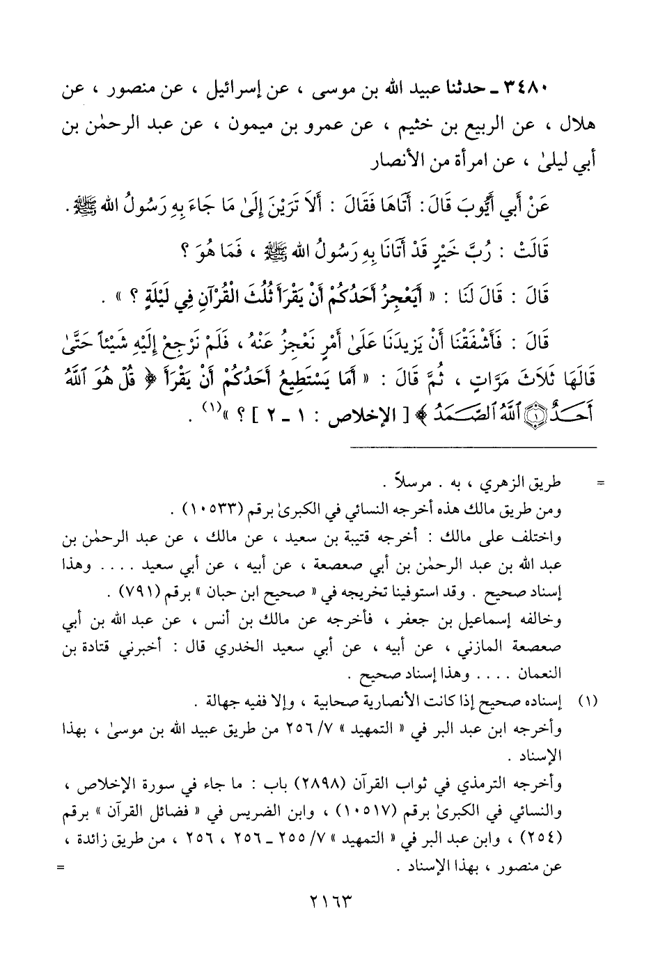 3480 - حَدَّثَنَا عُبَيْدُ اللَّهِ بْنُ مُوسَى، عَنْ إِسْرَائِيلَ، عَنْ مَنْصُورٍ، عَنْ هِلَالٍ، عَنْ الرَّبِيعِ بْنِ خُثَيْمٍ، عَنْ عَمْرِو بْنِ مَيْمُونٍ، عَنْ عَبْدِ الرَّحْمَنِ بْنِ أَبِي لَيْلَى، عَنْ امْرَأَةٍ، مِنَ الْأَنْصَارِ، عَنْ أَبِي أَيُّوبَ، قَالَ: أَتَاهَا فَقَالَ: أَلَا تَرَيْنَ إِلَى مَا جَاءَ بِهِ رَسُولُ اللَّهِ صَلَّى اللهُ عَلَيْهِ وَسَلَّمَ، قَالَتْ: رُبَّ خَيْرٍ قَدْ أَتَانَا بِهِ رَسُولُ اللَّهِ صَلَّى اللهُ عَلَيْهِ وَسَلَّمَ، فَمَا هُوَ؟ قَالَ: قَالَ لَنَا: «§أَيَعْجِزُ أَحَدُكُمْ أَنْ يَقْرَأَ ثُلُثَ الْقُرْآنِ فِي لَيْلَةٍ؟». قَالَ: فَأَشْفَقْنَا أَنْ يُزِيدَنَا عَلَى أَمْرٍ نَعْجِزُ عَنْهُ، فَلَمْ نَرْجِعْ إِلَيْهِ شَيْئًا حَتَّى قَالَهَا ثَلَاثَ مَرَّاتٍ، ثُمَّ قَالَ: «أَمَا يَسْتَطِيعُ أَحَدُكُمْ أَنْ يَقْرَأَ قُلْ هُوَ اللَّهُ أَحَدٌ اللَّهُ الصَّمَدُ» Qإسناده صحيح إذا كانت الأنصارية صحابية وإلا ففيه جهالة