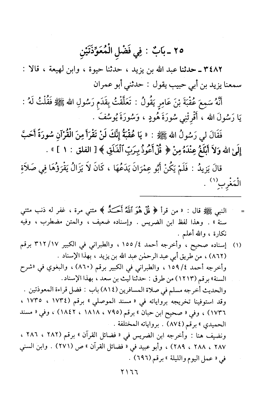 3482 - حَدَّثَنَا عَبْدُ اللَّهِ بْنُ يَزِيدَ، حَدَّثَنَا حَيْوَةُ، وَابْنُ لَهِيعَةَ، قَالَا: سَمِعْنَا يَزِيدَ بْنَ أَبِي حَبِيبٍ، يَقُولُ: حَدَّثَنِي أَبُو عِمْرَانَ، أَنَّهُ سَمِعَ عُقْبَةَ بْنَ عَامِرٍ، يَقُولُ: تَعَلَّقْتُ بِقَدَمِ رَسُولِ اللَّهِ صَلَّى اللهُ عَلَيْهِ وَسَلَّمَ فَقُلْتُ لَهُ: يَا رَسُولَ اللَّهِ، أَقْرِئْنِي سُورَةَ هُودٍ، وَسُورَةَ يُوسُفَ. فَقَالَ لِي رَسُولُ اللَّهِ صَلَّى اللهُ عَلَيْهِ وَسَلَّمَ: «يَا عُقْبَةُ §إِنَّكَ لَنْ تَقْرَأَ مِنَ الْقُرْآنِ سُورَةً أَحَبَّ إِلَى اللَّهِ وَلَا أَبْلَغَ عِنْدَهُ مِنْ قُلْ أَعُوذُ بِرَبِّ الْفَلَقِ» قَالَ يَزِيدُ: «فَلَمْ يَكُنْ أَبُو عِمْرَانَ يَدَعُهَا، كَانَ لَا يَزَالُ يَقْرَؤُهَا فِي صَلَاةِ الْمَغْرِبِ» Qإسناده صحيح