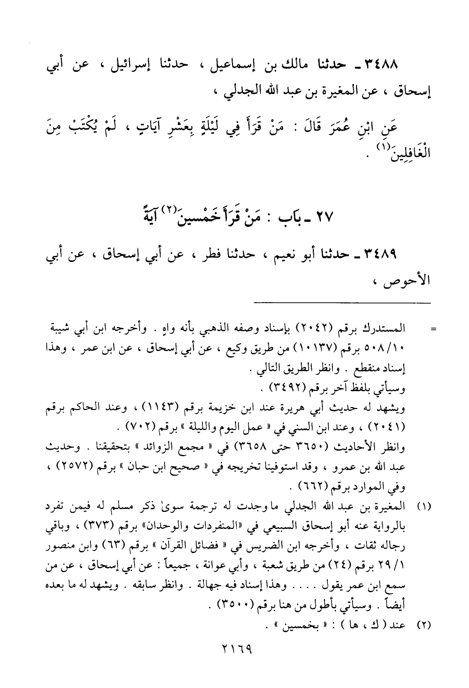 3489 - حَدَّثَنَا أَبُو نُعَيْمٍ، حَدَّثَنَا فِطْرٌ، عَنْ أَبِي إِسْحَاقَ، عَنْ أَبِي الْأَحْوَصِ، -[2170]- عَنْ عَبْدِ اللَّهِ، قَالَ: «§مَنْ قَرَأَ فِي لَيْلَةٍ بِخَمْسِينَ آيَةً، لَمْ يُكْتَبْ مِنَ الْغَافِلِينَ» Qإسناده صحيح