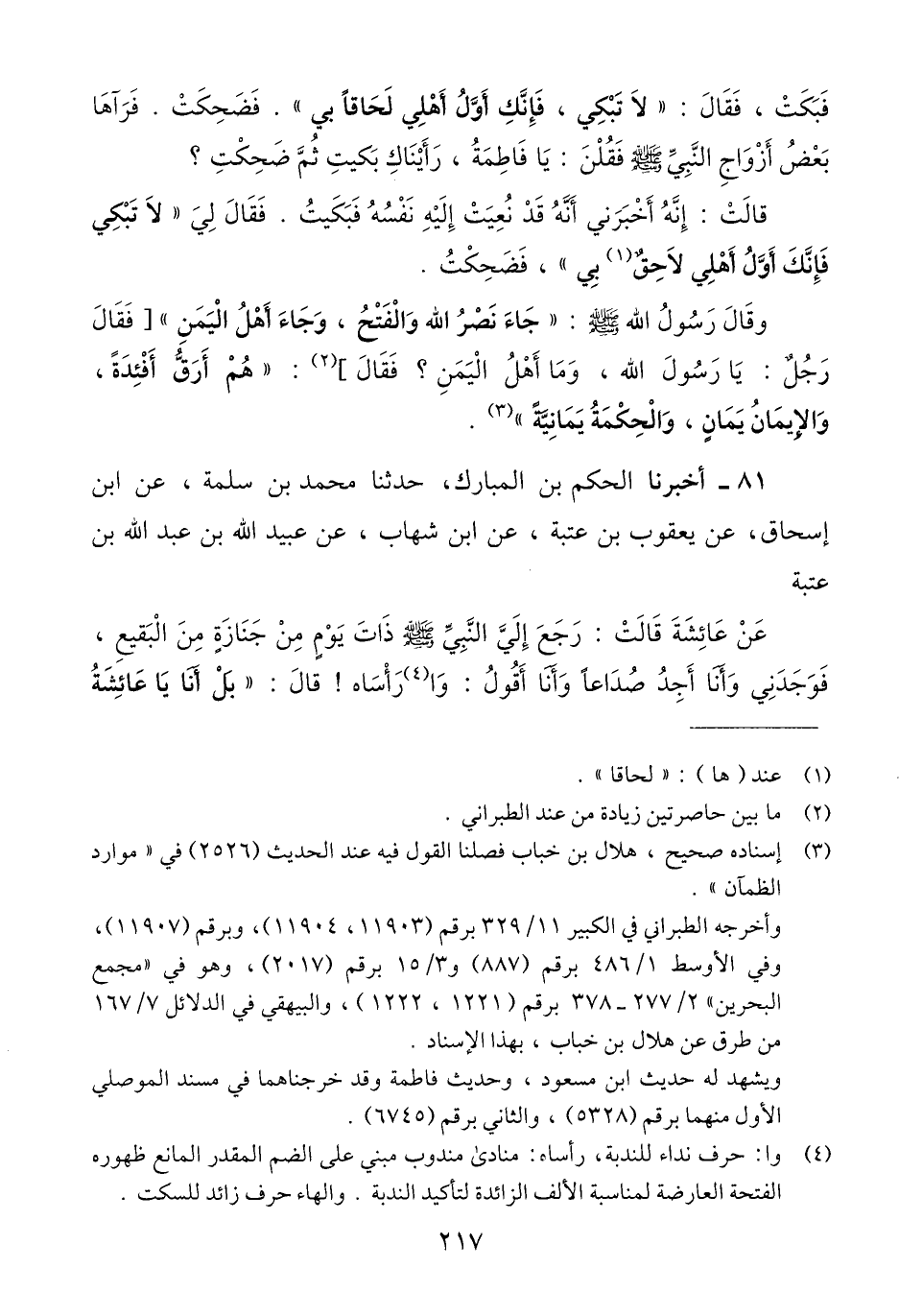 81 - أَخْبَرَنَا الْحَكَمُ بْنُ الْمُبَارَكِ، حَدَّثَنَا مُحَمَّدُ بْنُ سَلَمَةَ، عَنِ ابْنِ إِسْحَاقَ، عَنْ يَعْقُوبَ بْنِ عُتْبَةَ، عَنِ ابْنِ شِهَابٍ عَنْ عُبَيْدِ اللَّهِ بْنِ عَبْدِ اللَّهِ بْنِ عُتْبَةَ، عَنْ عَائِشَةَ قَالَتْ: رَجَعَ إِلَيَّ النَّبِيُّ صَلَّى اللهُ عَلَيْهِ وَسَلَّمَ ذَاتَ يَوْمٍ مِنْ جِنَازَةٍ مِنَ الْبَقِيعِ، فَوَجَدَنِي وَأَنَا أَجِدُ صُدَاعًا وَأَنَا أَقُولُ: وَا رَأْسَاهُ، قَالَ: «بَلْ أَنَا يَا عَائِشَةُ -[218]- وَا رَأْسَاهُ»، قَالَ: «§وَمَا ضَرَّكِ لَوْ مُتِّ قَبْلِي فَغَسَّلْتُكِ وَكَفَّنْتُكِ وَصَلَّيْتُ عَلَيْكِ وَدَفَنْتُكِ؟»، فَقُلْتُ: لَكَأَنِّي بِكَ وَاللَّهِ لَوْ فَعَلْتَ ذَلِكَ لَرَجَعْتَ إِلَى بَيْتِي فَأَعْرَسْتَ فِيهِ بِبَعْضِ نِسَائِكَ، قَالَتْ: فَتَبَسَّمَ رَسُولُ اللَّهِ صَلَّى اللهُ عَلَيْهِ وَسَلَّمَ، ثُمَّ بُدِئَ فِي وَجَعِهِ الَّذِي مَاتَ فِيهِQرجاله ثقات غير أن ابن إسحاق مدلس وقد عنعن ولكنه صرح بالتحديث في رواية البيهقي فانتفت شبه التدليس
