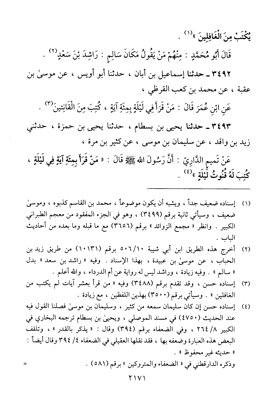 3493 - حَدَّثَنَا يَحْيَى بْنُ بِسْطَامَ، حَدَّثَنَا يَحْيَى بْنُ حَمْزَةَ، حَدَّثَنِي زَيْدُ بْنُ وَاقِدٍ، عَنْ سُلَيْمَانَ بْنِ مُوسَى، عَنْ كَثِيرِ بْنِ مُرَّةَ، عَنْ تَمِيمٍ الدَّارِيِّ، أَنَّ رَسُولَ اللَّهِ صَلَّى اللهُ عَلَيْهِ وَسَلَّمَ قَالَ: «§مَنْ قَرَأَ بِمِائَةِ آيَةٍ فِي لَيْلَةٍ، كُتِبَ لَهُ قُنُوتُ لَيْلَةٍ» Qإسناده حسن إن كان سليمان سمعه من كثير