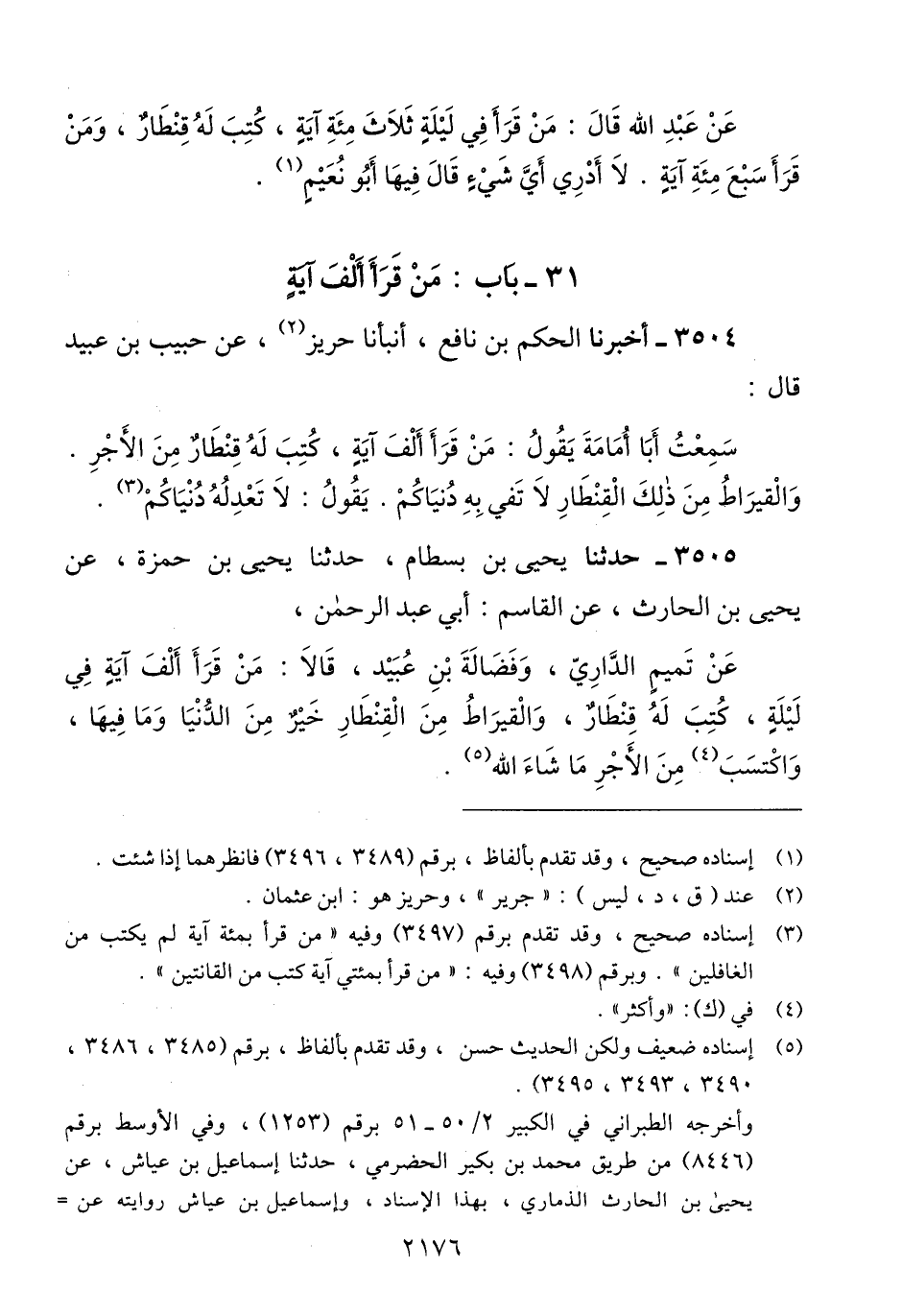 3505 - حَدَّثَنَا يَحْيَى بْنُ بِسْطَامَ، حَدَّثَنَا يَحْيَى بْنُ حَمْزَةَ، عَنْ يَحْيَى بْنِ الْحَارِثِ، عَنْ الْقَاسِمِ أَبِي عَبْدِ الرَّحْمَنِ، عَنْ تَمِيمٍ الدَّارِيِّ، وَفَضَالَةَ بْنِ عُبَيْدٍ، قَالَا: «§مَنْ قَرَأَ أَلْفَ آيَةٍ فِي لَيْلَةٍ كُتِبَ لَهُ قِنْطَارٌ، وَالْقِيرَاطُ مِنَ الْقِنْطَارِ خَيْرٌ مِنَ الدُّنْيَا وَمَا فِيهَا، وَاكْتَسَبَ مِنَ الْأَجْرِ مَا شَاءَ اللَّهُ» Qإسناده ضعيف ولكن الحديث حسن