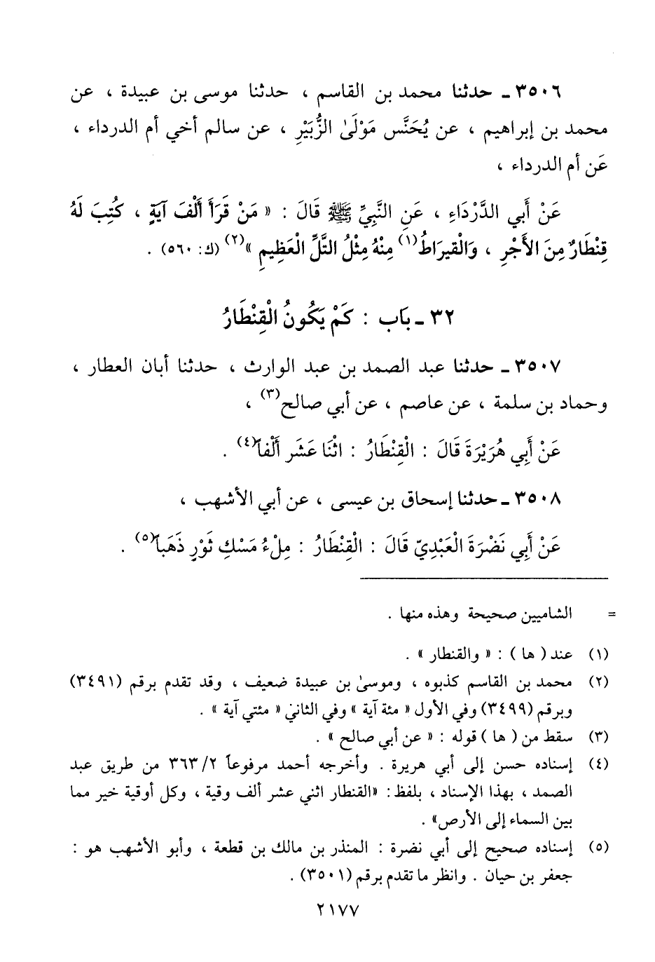 3506 - حَدَّثَنَا مُحَمَّدُ بْنُ الْقَاسِمِ، حَدَّثَنَا مُوسَى بْنُ عُبَيْدَةَ، عَنْ مُحَمَّدِ بْنِ إِبْرَاهِيمَ، عَنْ يُحَنَّسَ، مَوْلَى الزُّبَيْرِ، عَنْ سَالِمٍ، أَخِي أُمِّ الدَّرْدَاءِ، عَنْ أُمِّ الدَّرْدَاءِ، عَنْ أَبِي الدَّرْدَاءِ، عَنِ النَّبِيِّ صَلَّى اللهُ عَلَيْهِ وَسَلَّمَ قَالَ: «§مَنْ قَرَأَ أَلْفَ آيَةٍ كُتِبَ لَهُ قِنْطَارٌ مِنَ الْأَجْرِ، الْقِيرَاطُ مِنْهُ مِثْلُ التَّلِّ الْعَظِيمِ» Qمحمد بن القاسم كذبوه وموسى بن عبيدة ضعيف
