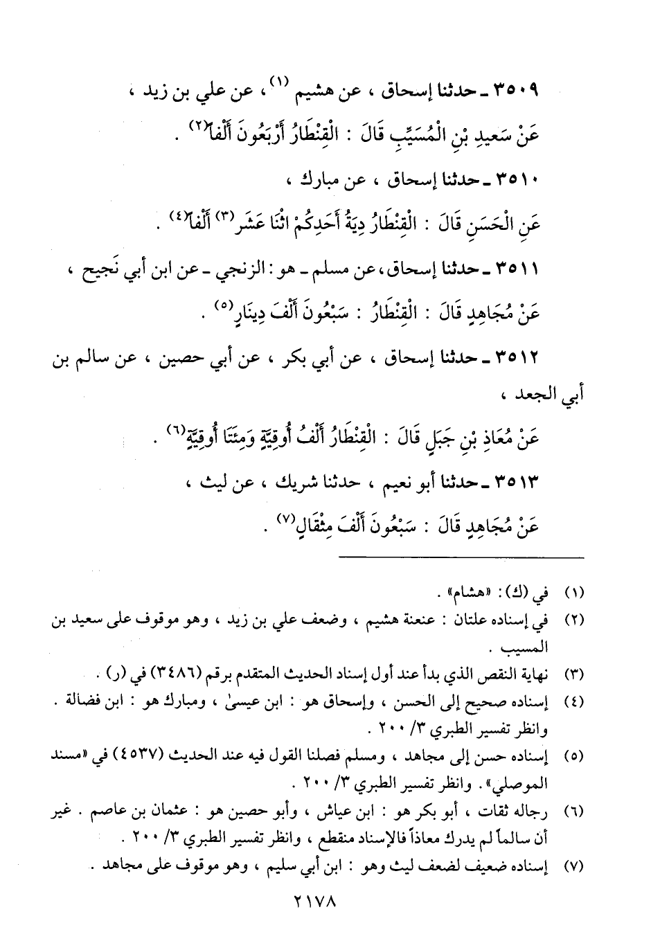 3511 - حَدَّثَنَا إِسْحَاقُ، عَنْ مُسْلِمٍ هُوَ الزَّنْجِيُّ، عَنْ ابْنِ أَبِي نَجِيحٍ، عَنْ مُجَاهِدٍ، قَالَ: " §الْقِنْطَارُ: سَبْعُونَ أَلْفَ دِينَارٍ "Qإسناده حسن إلى مجاهد