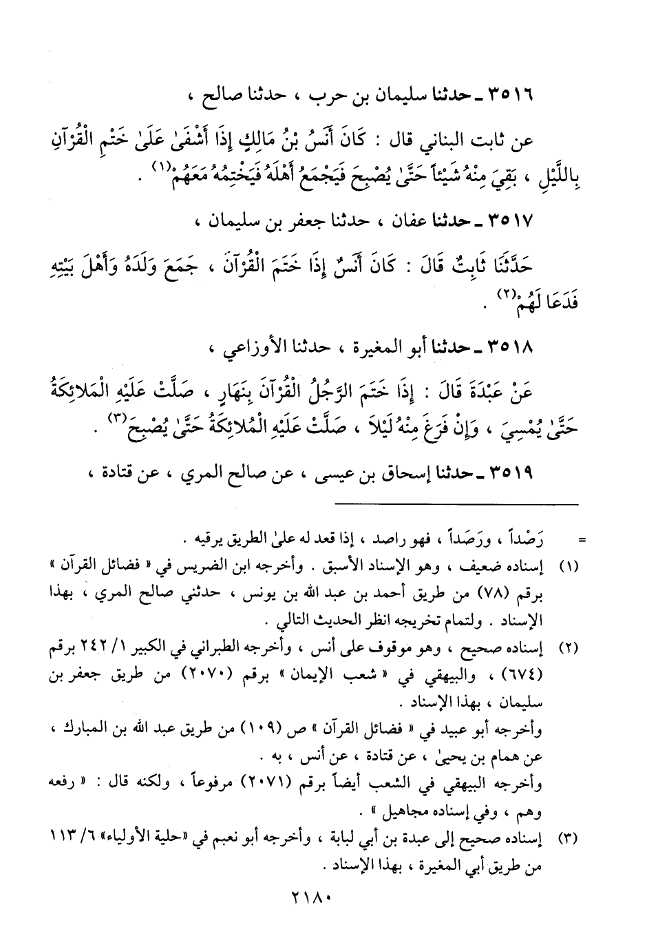 3516 - حَدَّثَنَا سُلَيْمَانُ بْنُ حَرْبٍ، حَدَّثَنَا صَالِحٌ، عَنْ ثَابِتٍ الْبُنَانِيِّ، قَالَ: «كَانَ أَنَسُ بْنُ مَالِكٍ، §إِذَا أَشْفَى عَلَى خَتْمِ الْقُرْآنِ بِاللَّيْلِ، بَقَّى مِنْهُ شَيْئًا حَتَّى يُصْبِحَ فَيَجْمَعَ أَهْلَهُ فَيَخْتِمَهُ مَعَهُمْ» Qإسناده ضعيف وهو الإسناد الأسبق