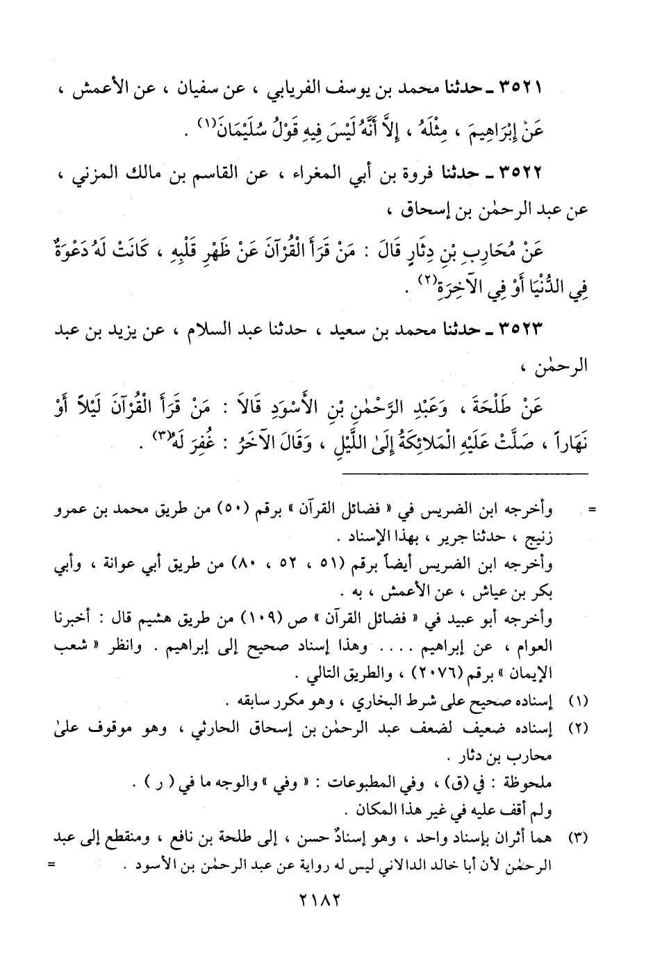 3523 - حَدَّثَنَا مُحَمَّدُ بْنُ سَعِيدٍ، حَدَّثَنَا عَبْدُ السَّلَامِ، عَنْ يَزِيدَ بْنِ عَبْدِ الرَّحْمَنِ، عَنْ طَلْحَةَ، وَعَبْدِ الرَّحْمَنِ بْنِ الْأَسْوَدِ، قَالَا: «§مَنْ قَرَأَ الْقُرْآنَ لَيْلًا أَوْ نَهَارًا، صَلَّتْ عَلَيْهِ الْمَلَائِكَةُ إِلَى اللَّيْلِ»، وَقَالَ الْآخَرُ: «غُفِرَ لَهُ» Qهما أثران بإسناد واحد وهو إسناد حسن إلى طلحة بن نافع ومنقطع إلى عبد الرحمن لأن أبا خالد الدالاني ليس له رواية عن عبد الرحمن بن الأسود