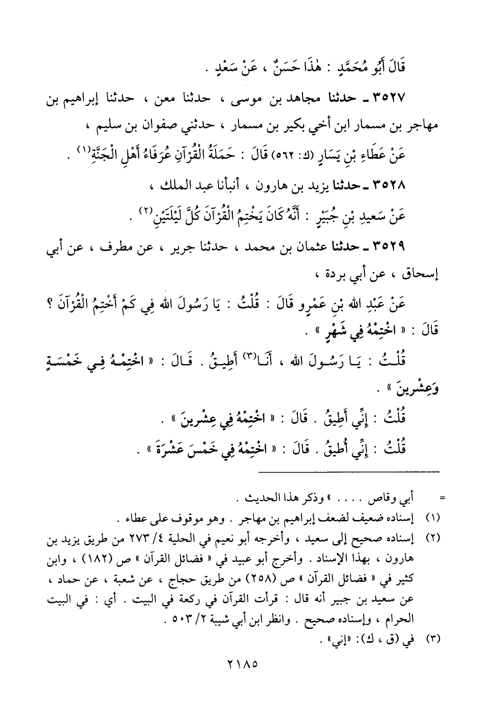 3529 - حَدَّثَنَا عُثْمَانُ بْنُ مُحَمَّدٍ، حَدَّثَنَا جَرِيرٌ، عَنْ مُطَرِّفٍ، عَنْ أَبِي إِسْحَاقَ، عَنْ أَبِي بُرْدَةَ، عَنْ عَبْدِ اللَّهِ بْنِ عَمْرٍو، قَالَ: قُلْتُ: يَا رَسُولَ اللَّهِ فِي كَمْ أَخْتِمُ الْقُرْآنَ؟ قَالَ: «§اخْتِمْهُ فِي شَهْرٍ». قُلْتُ: يَا رَسُولَ اللَّهِ، أَنَا أُطِيقُ. قَالَ: «اخْتِمْهُ فِي خَمْسٍ وَعِشْرِينَ». قُلْتُ: إِنِّي أُطِيقُ. قَالَ: «اخْتِمْهُ فِي عِشْرِينَ». قُلْتُ: إِنِّي أُطِيقُ. قَالَ: «اخْتِمْهُ فِي خَمْسَ عَشْرَةَ». -[2186]- قُلْتُ: إِنِّي أُطِيقُ. قَالَ: «اخْتِمْهُ فِي عَشْرٍ». قُلْتُ: إِنِّي أُطِيقُ. قَالَ: «اخْتِمْهُ فِي خَمْسٍ». قُلْتُ: إِنِّي أُطِيقُ. قَالَ: «لَا» Qإسناده ضعيف مطرف بن طريف متأخر السماع من أبي إسحاق السبيعي ولكن الحديث متفق عليه