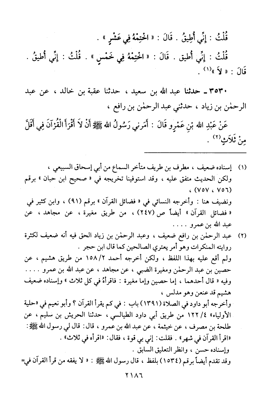 3530 - حَدَّثَنَا عَبْدُ اللَّهِ بْنُ سَعِيدٍ، حَدَّثَنَا عُقْبَةُ بْنُ خَالِدٍ، عَنْ عَبْدِ الرَّحْمَنِ بْنِ زِيَادٍ، حَدَّثَنِي عَبْدُ الرَّحْمَنِ بْنُ رَافِعٍ، عَنْ عَبْدِ اللَّهِ بْنِ عَمْرٍو، قَالَ: «§أَمَرَنِي رَسُولُ اللَّهِ صَلَّى اللهُ عَلَيْهِ وَسَلَّمَ أَنْ لَا أَقْرَأَ الْقُرْآنَ فِي أَقَلَّ مِنْ ثَلَاثٍ» Qعبد الرحمن بن رافع ضعيف وعبد الرحمن بن زياد الحق فيه أنه ضعيف لكثرة روايته المنكرات