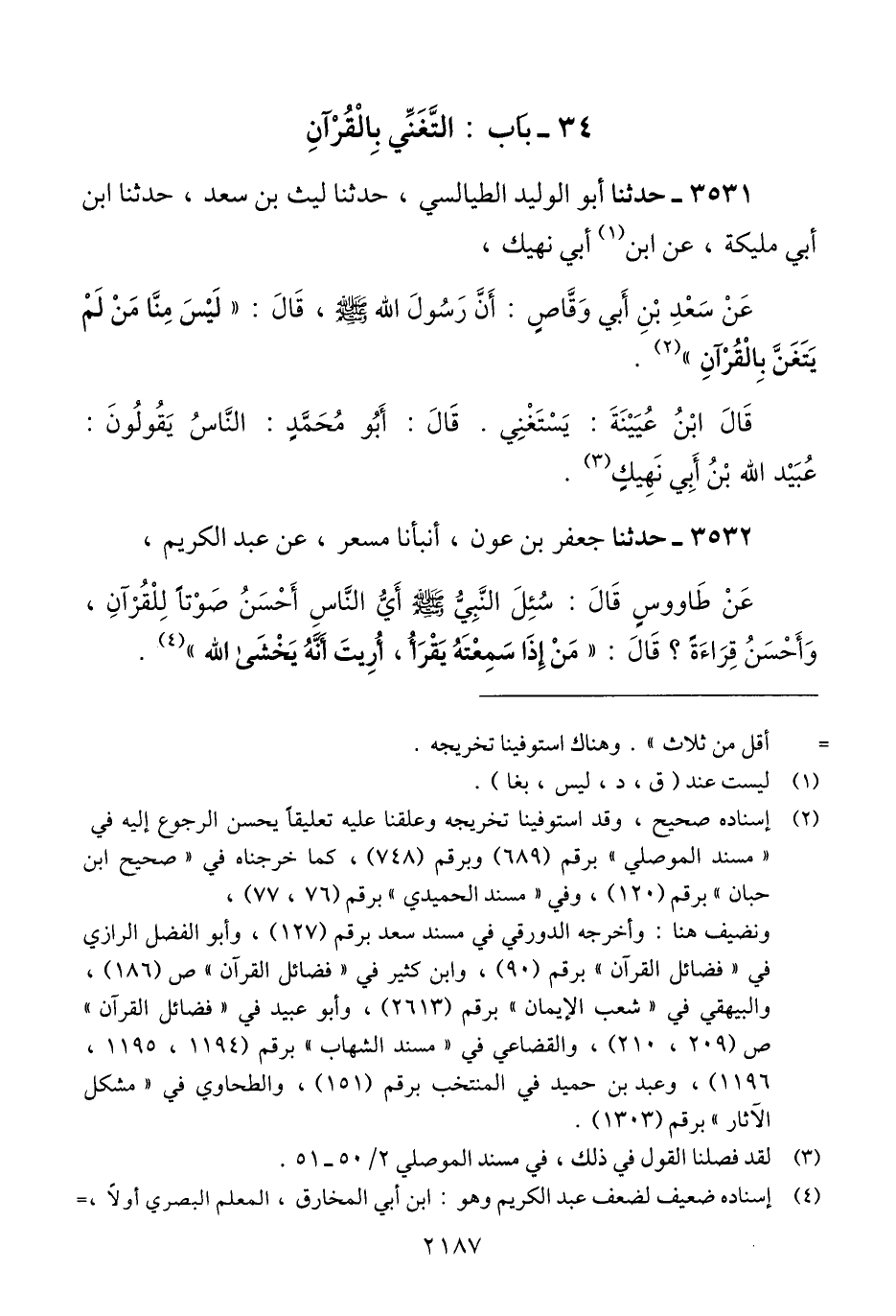 3531 - حَدَّثَنَا أَبُو الْوَلِيدِ الطَّيَالِسِيُّ، حَدَّثَنَا لَيْثُ بْنُ سَعْدٍ، حَدَّثَنَا ابْنُ أَبِي مُلَيْكَةَ، عَنْ ابْنِ أَبِي نَهِيكٍ، عَنْ سَعْدِ بْنِ أَبِي وَقَّاصٍ، أَنَّ رَسُولَ اللَّهِ صَلَّى اللهُ عَلَيْهِ وَسَلَّمَ قَالَ: «§لَيْسَ مِنَّا مَنْ لَمْ يَتَغَنَّ بِالْقُرْآنِ» قال ابْنُ عُيَيْنَةَ: يَسْتَغْنِي. قَالَ أَبُو مُحَمَّد: " النَّاسُ يَقُولُونَ: عُبَيْدُ اللَّهِ بْنُ أَبِي نَهِيكٍ "Qإسناده صحيح