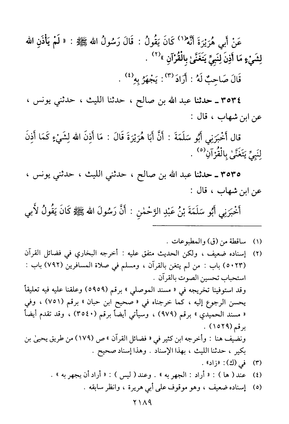 3534 - حَدَّثَنَا عَبْدُ اللَّهِ بْنُ صَالِحٍ، حَدَّثَنَا اللَّيْثُ، حَدَّثَنِي يُونُسُ، عَنْ ابْنِ شِهَابٍ، قَالَ: قَالَ: أَخْبَرَنِي أَبُو سَلَمَةَ، أَنَّ أَبَا هُرَيْرَةَ، قَالَ: «§مَا أَذِنَ اللَّهُ لِشَيْءٍ كَمَا أَذِنَ لِنَبِيٍّ يَتَغَنَّى بِالْقُرْآنِ» Qإسناده ضعيف وهو موقوف على أبي هريرة