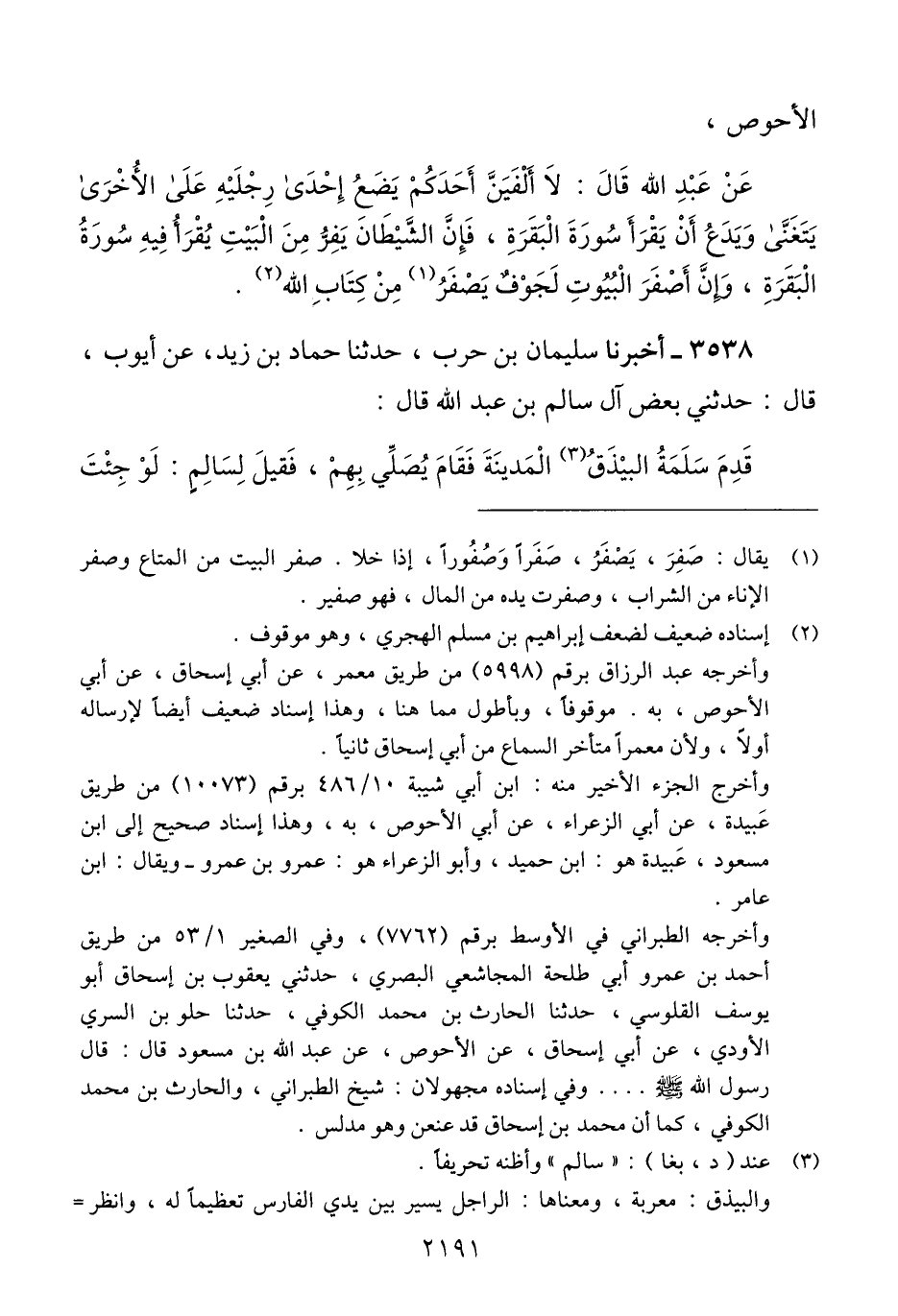 3538 - أَخْبَرَنَا سُلَيْمَانُ بْنُ حَرْبٍ، حَدَّثَنَا حَمَّادُ بْنُ زَيْدٍ، عَنْ أَيُّوبَ، قَالَ: حَدَّثَنِي بَعْضُ، آلِ سَالِمِ بْنِ عَبْدِ اللَّهِ، قَالَ: قَدِمَ سَلَمَةُ الْبَيْذَقُ الْمَدِينَةَ فَقَامَ يُصَلِّي بِهِمْ، فَقِيلَ لِسَالِمٍ: لَوْ جِئْتَ -[2192]- فَسَمِعْتَ قِرَاءَتَهُ، فَلَمَّا كَانَ بِبَابِ الْمَسْجِدِ، سَمِعَ قِرَاءَتَهُ رَجَعَ فَقَالَ: «§غِنَاءٌ غِنَاءٌ» Qإسناده ضعيف فيه جهالة وابن جريج قد عنعن وهو مدلس