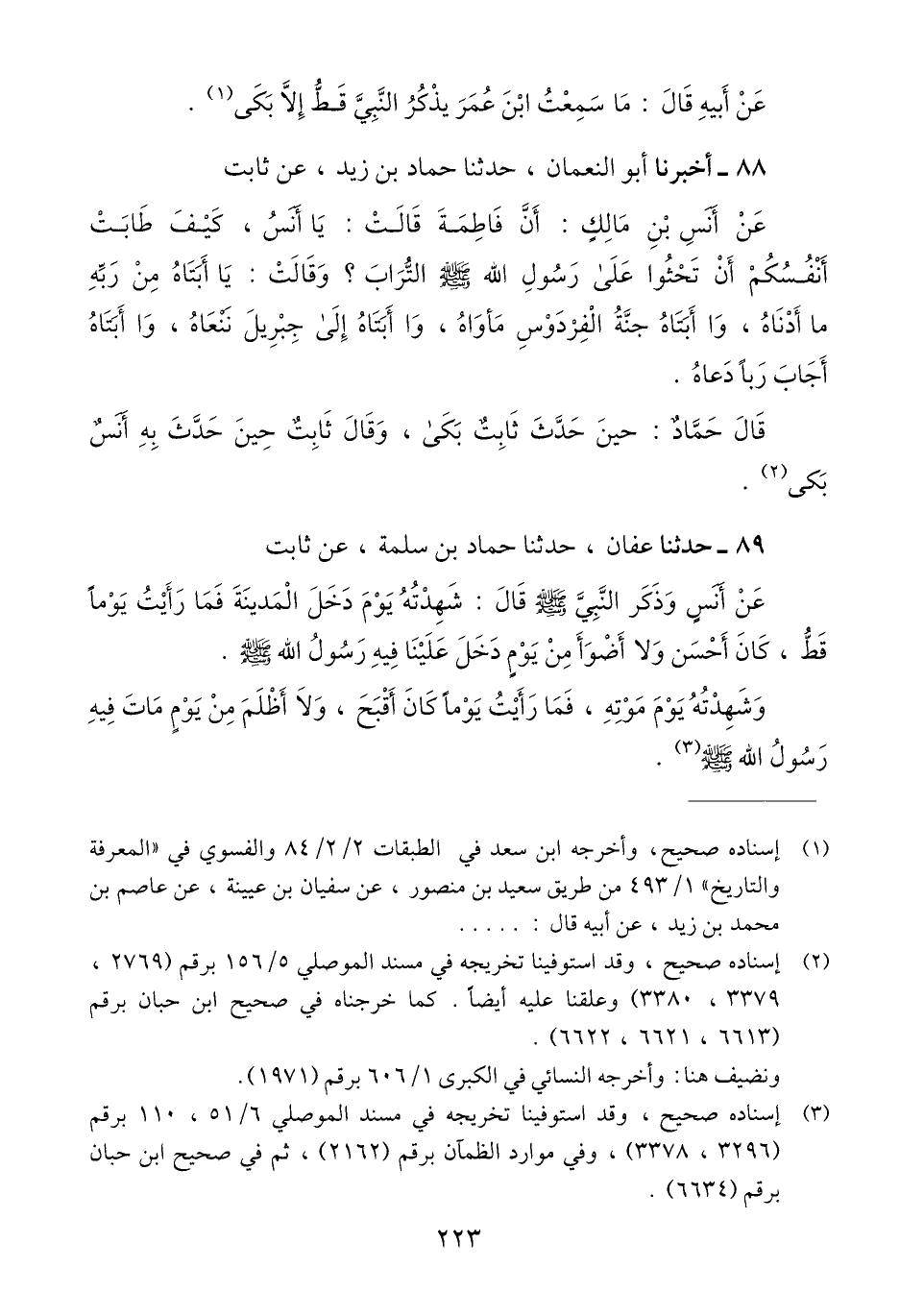 88 - أَخْبَرَنَا أَبُو النُّعْمَانِ، حَدَّثَنَا حَمَّادُ بْنُ زَيْدٍ، عَنْ ثَابِتٍ، عَنْ أَنَسِ بْنِ مَالِكٍ،: " أَنَّ فَاطِمَةَ قَالَتْ: يَا أَنَسُ، §كَيْفَ طَابَتْ أَنْفُسُكُمْ أَنْ تَحْثُوا عَلَى رَسُولِ اللَّهِ صَلَّى اللهُ عَلَيْهِ وَسَلَّمَ التُّرَابَ؟ وَقَالَتْ: يَا أَبَتَاهْ مِنْ رَبِّهِ مَا أَدْنَاهْ وَا أَبَتَاهْ جَنَّةُ الْفِرْدَوْسِ مَأْوَاهْ وَا أَبَتَاهْ إِلَى جِبْرِيلَ نَنْعَاهْ وَا أَبَتَاهْ أَجَابَ رَبًّا دَعَاهْ " قَالَ حَمَّادٌ: حِينَ حَدَّثَ ثَابِتٌ بَكَى، وقالَ ثَابِتٌ حِينَ حَدَّثَ بِهِ أَنَسٌ بَكَىQإسناده صحيح