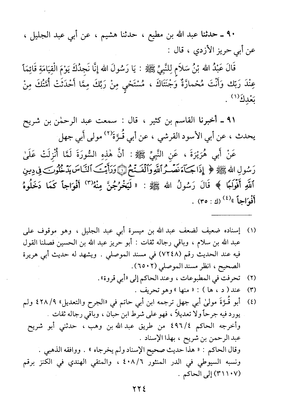 90 - حَدَّثَنَا عَبْدُ اللَّهِ بْنُ مُطِيعٍ، حَدَّثَنَا هُشَيْمٌ، عَنْ أَبِي عَبْدِ الْجَلِيلِ، عَنْ أَبِي حَرِيزٍ الْأَزْدِيِّ، قَالَ: قَالَ عَبْدُ اللَّهِ بْنُ سَلَامٍ لِلنَّبِيِّ صَلَّى اللهُ عَلَيْهِ وَسَلَّمَ: يَا رَسُولَ اللَّهِ §إِنَّا نَجِدُكَ يَوْمَ الْقِيَامَةِ قَائِمًا عِنْدَ رَبِّكَ وَأَنْتَ مُحْمَارَّةٌ وَجْنَتَاكَ، مُسْتَحْيٍ مِنْ رَبِّكَ مِمَّا أَحْدَثَتْ أُمَّتُكَ مِنْ بَعْدِكَQإسناده ضعيف لضعف عبد الله بن ميسرة أبي عبد الجليل وهو موقوف على عبد الله بن سلام وباقي رجاله ثقات
