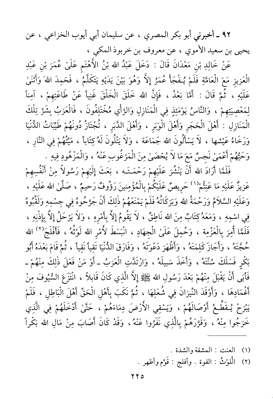 92 - أَخْبَرَنِي أَبُو بَكْرٍ الْمِصْرِيُّ، عَنْ سُلَيْمَانَ أَبِي أَيُّوبَ الْخُزَاعِيِّ، عَنْ يَحْيَى بْنِ سَعِيدٍ الْأُمَوِيِّ، عَنْ مَعْرُوفِ بْنِ خَرَّبُوذَ الْمَكِّيِّ، عَنْ خَالِدِ بْنِ مَعْدَانَ قَالَ: دَخَلَ عَبْدُ اللَّهِ بْنُ الْأَهْتَمِ عَلَى عُمَرَ بْنِ عَبْدِ الْعَزِيزِ مَعَ الْعَامَّةِ فَلَمْ يَفْجَأْ عُمَرَ إِلَّا وَهُوَ بَيْنَ يَدَيْهِ يَتَكَلَّمُ، " فَحَمِدَ اللَّهَ وَأَثْنَى عَلَيْهِ، ثُمَّ قَالَ: أَمَّا بَعْدُ، فَإِنَّ §اللَّهَ خَلَقَ الْخَلْقَ غَنِيًّا عَنْ طَاعَتِهِمْ، آمِنًا لِمَعْصِيَتِهِمْ، وَالنَّاسُ يَوْمَئِذٍ فِي الْمَنَازِلِ وَالرَّأْيِ مُخْتَلِفُونَ، فَالْعَرَبُ بِشَرِّ تِلْكَ الْمَنَازِلِ: أَهْلُ الْحَجَرِ وَأَهْلُ الْوَبَرِ، وَأَهْلُ الدَّبَرِ، تَجْتَازَ دُونَهُمْ طَيِّبَاتُ الدُّنْيَا وَرَخَاءُ عَيْشِهَا، لَا يَسْأَلُونَ اللَّهَ جَمَاعَةً، وَلَا يَتْلُونَ لَهُ كِتَابًا، مَيِّتُهُمْ فِي النَّارِ، وَحَيُّهُمْ أَعْمَى نَجِسٌ مَعَ مَا لَا يُحْصَى مِنَ الْمَرْغُوبِ عَنْهُ، وَالْمَزْهُودِ فِيهِ. فَلَمَّا أَرَادَ اللَّهُ أَنْ يَنْشُرَ عَلَيْهِمْ رَحْمَتَهُ، بَعَثَ إِلَيْهِمْ رَسُولًا مِنْ أَنْفُسِهِمْ عَزِيزٌ عَلَيْهِ مَا عَنِتُّمْ حَرِيصٌ عَلَيْكُمْ بِالْمُؤْمِنِينَ رَءُوفٌ رَحِيمٌ، صَلَّى اللَّهُ عَلَيْهِ، وَعَلَيْهِ السَّلَامُ وَرَحْمَةُ اللَّهِ وَبَرَكَاتُهُ فَلَمْ يَمْنَعْهُمْ ذَلِكَ أَنْ جَرَحُوهُ فِي جِسْمِهِ وَلَقَّبُوهُ فِي اسْمِهِ، وَمَعَهُ كِتَابٌ مِنَ اللَّهِ نَاطِقٌ، لَا يُقَوَّمُ إِلَّا بِأَمْرِهِ، وَلَا يُرْحَلُ إِلَّا بِإِذْنِهِ، فَلَمَّا أُمِرَ بِالْعَزْمَةِ، وَحُمِلَ عَلَى الْجِهَادِ، انْبَسَطَ لِأَمْرِ اللَّهِ لَوْثُهُ، فَأَفْلَجَ اللَّهُ حُجَّتَهُ، وَأَجَازَ كَلِمَتَهُ، وَأَظْهَرَ دَعْوَتَهُ، وَفَارَقَ الدُّنْيَا تَقِيًّا نَقِيًّا، ثُمَّ قَامَ بَعْدَهُ أَبُو بَكْرٍ فَسَلَكَ سُنَّتَهُ، وَأَخَذَ سَبِيلَهُ، وَارْتَدَّتْ الْعَرَبُ - أَوْ مَنْ فَعَلَ ذَلِكَ مِنْهُمْ - فَأَبَى أَنْ يَقْبَلَ مِنْهُمْ بَعْدَ رَسُولِ اللَّهِ صَلَّى اللهُ عَلَيْهِ وَسَلَّمَ إِلَّا الَّذِي كَانَ قَابِلًا، انْتَزَعَ السُّيُوفَ مِنْ أَغْمَادِهَا، وَأَوْقَدَ النِّيرَانَ فِي شُعُلِهَا، ثُمَّ نُكِبَ بِأَهْلِ الْحَقِّ أَهْلُ الْبَاطِلِ، فَلَمْ يَبْرَحْ يُقَطِّعُ أَوْصَالَهُمْ، وَيَسْقِي الْأَرْضَ دِمَاءَهُمْ، حَتَّى أَدْخَلَهُمْ فِي الَّذِي خَرَجُوا مِنْهُ، وَقَرَّرَهُمْ بِالَّذِي نَفَرُوا عَنْهُ، وَقَدْ كَانَ أَصَابَ مِنْ مَالِ اللَّهِ بَكْرًا -[226]- يَرْتَوِي عَلَيْهِ، وَحَبَشِيَّةً أَرْضَعَتْ وَلَدًا لَهُ، فَرَأَى ذَلِكَ عِنْدَ مَوْتِهِ غُصَّةً فِي حَلْقِهِ فَأَدَّى ذَلِكَ إِلَى الْخَلِيفَةِ مِنْ بَعْدِهِ وَفَارَقَ الدُّنْيَا تَقِيًّا نَقِيًّا عَلَى مِنْهَاجِ صَاحِبِهِ. ثُمَّ قَامَ بَعْدَهُ عُمَرُ بْنُ الْخَطَّابِ فَمَصَّرَ الْأَمْصَارَ، وَخَلَطَ الشِّدَّةَ بِاللِّينِ، وَحَسَرَ عَنْ ذِرَاعَيْهِ، وَشَمَّرَ عَنْ سَاقَيْهِ وعدَّ لِلْأُمُورِ أَقْرَانَهَا، وَلِلْحَرْبِ آلَتَهَا، فَلَمَّا أَصَابَهُ فَتَى الْمُغِيرَةِ بْنِ شُعْبَةَ، أَمَرَ ابْنَ عَبَّاسٍ يَسْأَلُ النَّاسَ: هَلْ يُثْبِتُونَ قَاتِلَهُ. فَلَمَّا قِيلَ: فَتَى الْمُغِيرَةِ بْنِ شُعْبَةَ، اسْتَهَلَّ يَحْمَدُ رَبَّهُ أَنْ لَا يَكُونَ أَصَابَهُ ذُو حَقٍّ فِي الْفَيْءِ فَيَحْتَجَّ عَلَيْهِ بِأَنَّهُ إِنَّمَا اسْتَحَلَّ دَمَهُ بِمَا اسْتَحَلَّ مِنْ حَقِّهِ، وَقَدْ كَانَ أَصَابَ مِنْ مَالِ اللَّهِ بِضْعَةً وَثَمَانِينَ أَلْفًا، فَكَسَرَ لَهَا رِبَاعَهُ وَكَرِهَ بِهَا كَفَالَةَ أَوْلَادِهِ، فَأَدَّاهَا إِلَى الْخَلِيفَةِ مِنْ بَعْدِهِ، وَفَارَقَ الدُّنْيَا تَقِيًّا نَقِيًّ