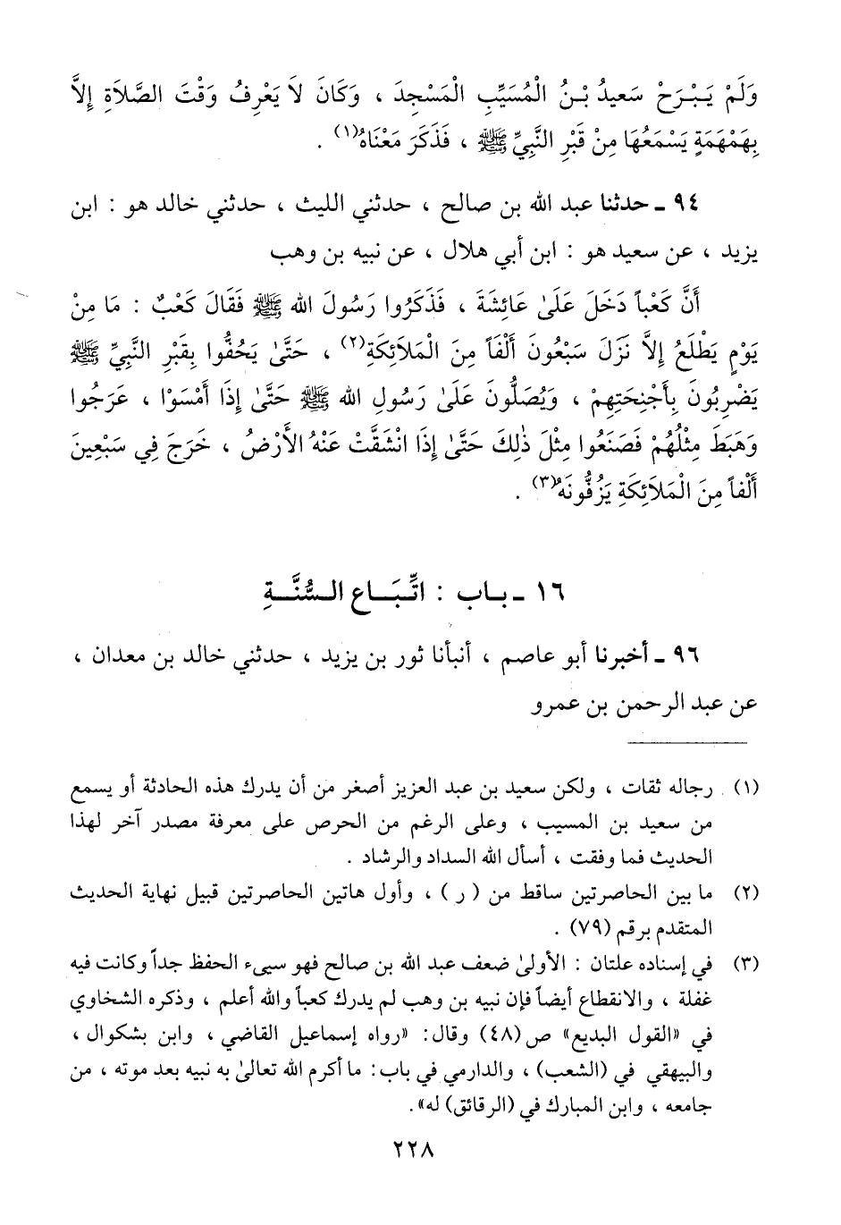 95 - حَدَّثَنَا عَبْدُ اللَّهِ بْنُ صَالِحٍ، حَدَّثَنِي اللَّيْثُ، حَدَّثَنِي خَالِدٌ هُوَ ابْنُ يَزِيدَ، عَنْ سَعِيدٍ هُوَ ابْنُ أَبِي هِلَالٍ، عَنْ نُبَيْهِ بْنِ وَهْبٍ، أَنَّ كَعْبًا دَخَلَ عَلَى عَائِشَةَ، فَذَكَرُوا رَسُولَ اللَّهِ صَلَّى اللهُ عَلَيْهِ وَسَلَّمَ فَقَالَ كَعْبٌ: " §مَا مِنْ يَوْمٍ يَطْلُعُ إِلَّا نَزَلَ سَبْعُونَ أَلْفًا مِنَ الْمَلَائِكَةِ، حَتَّى يَحُفُّوا بِقَبْرِ النَّبِيِّ صَلَّى اللهُ عَلَيْهِ وَسَلَّمَ يَضْرِبُونَ بِأَجْنِحَتِهِمْ، وَيُصَلُّونَ عَلَى رَسُولِ اللَّهِ صَلَّى اللهُ عَلَيْهِ وَسَلَّمَ حَتَّى إِذَا أَمْسَوْا، عَرَجُوا وَهَبَطَ مِثْلُهُمْ فَصَنَعُوا مِثْلَ ذَلِكَ حَتَّى إِذَا انْشَقَّتْ عَنْهُ الْأَرْضُ، خَرَجَ فِي سَبْعِينَ أَلْفًا مِنَ الْمَلَائِكَةِ يَزِفُّونَهُQفي إسناده علتان: الأولى ضعف عبد الله بن صالح فهو سيئ الحفظ جدا وكانت فيه غفلة والانقطاع أيضا فإن نبيه بن وهب لم يدرك كعبا