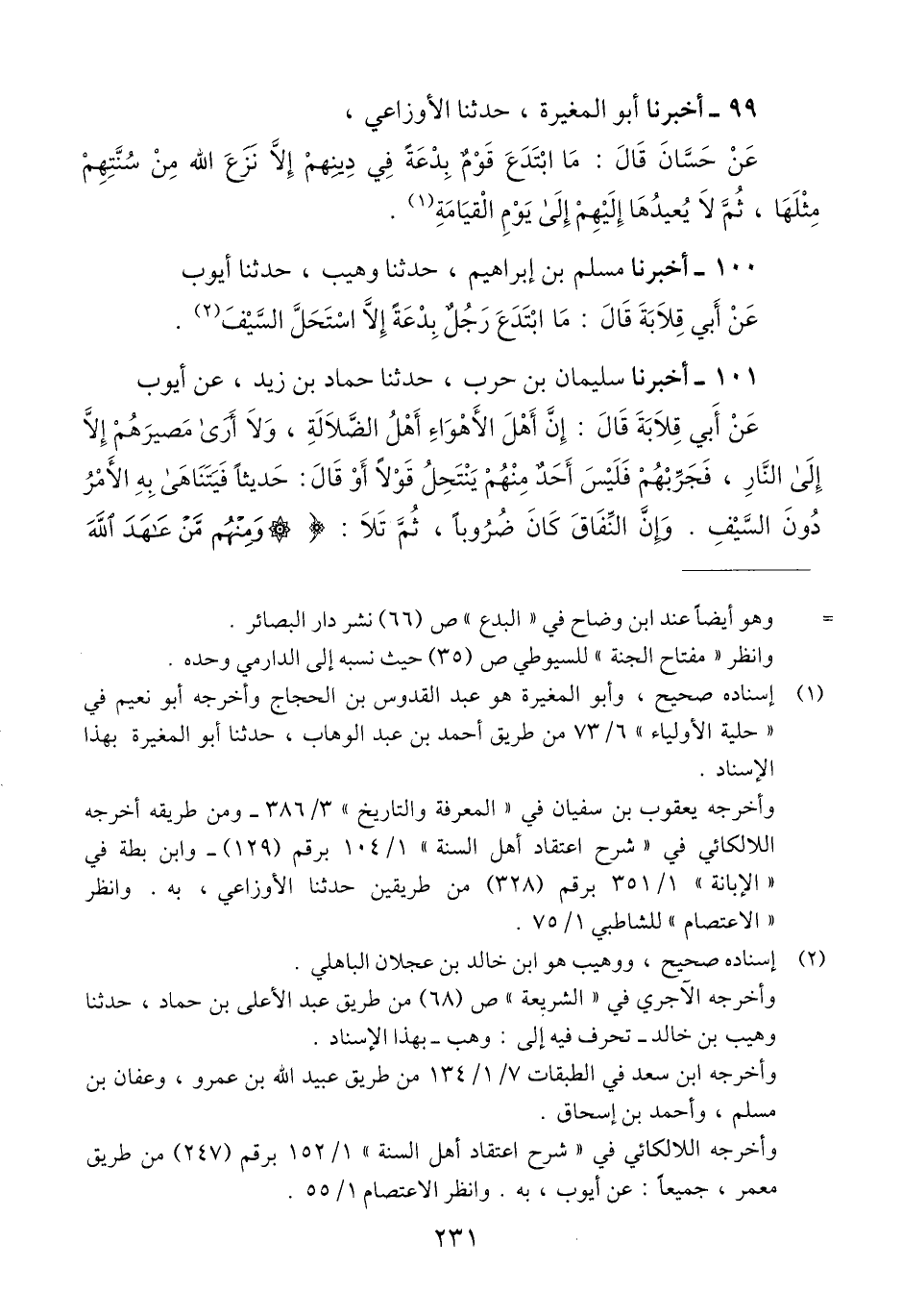 100 - أَخْبَرَنَا مُسْلِمُ بْنُ إِبْرَاهِيمَ، حَدَّثَنَا وُهَيْبٌ، حَدَّثَنَا أَيُّوبُ، عَنْ أَبِي قِلَابَةَ، قَالَ: «§مَا ابْتَدَعَ رَجُلٌ بِدْعَةً إِلَّا اسْتَحَلَّ السَّيْفَ» Qإسناده صحيح