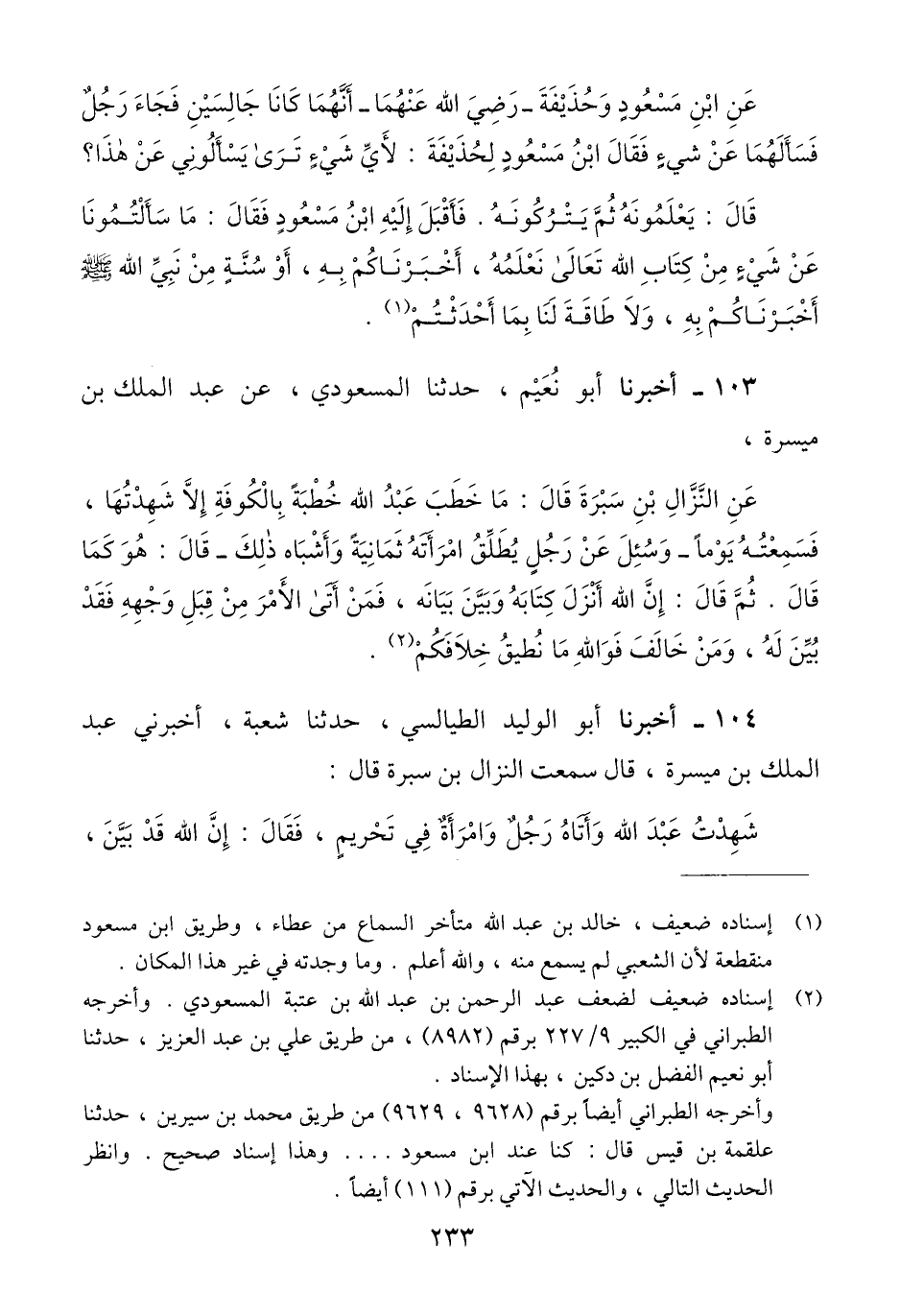 104 - أَخْبَرَنَا أَبُو الْوَلِيدِ الطَّيَالِسِيُّ، حَدَّثَنَا شُعْبَةُ، أَخْبَرَنِي عَبْدُ الْمَلِكِ بْنُ مَيْسَرَةَ، قَالَ سَمِعْتُ النَّزَّالَ بْنَ سَبْرَةَ، قَالَ: شَهِدْتُ عَبْدَ اللَّهِ وَأَتَاهُ رَجُلٌ وَامْرَأَةٌ فِي تَحْرِيمٍ، فَقَالَ: «إِنَّ اللَّهَ قَدْ بَيَّنَ، -[234]- §فَمَنْ أَتَى الْأَمْرَ مِنْ قِبَلِ وَجْهِهِ فَقَدْ بُيِّنَ وَمَنْ خَالَفَ فَوَاللَّهِ مَا نُطِيقُ خِلَافَكُمْ» Qإسناده صحيح