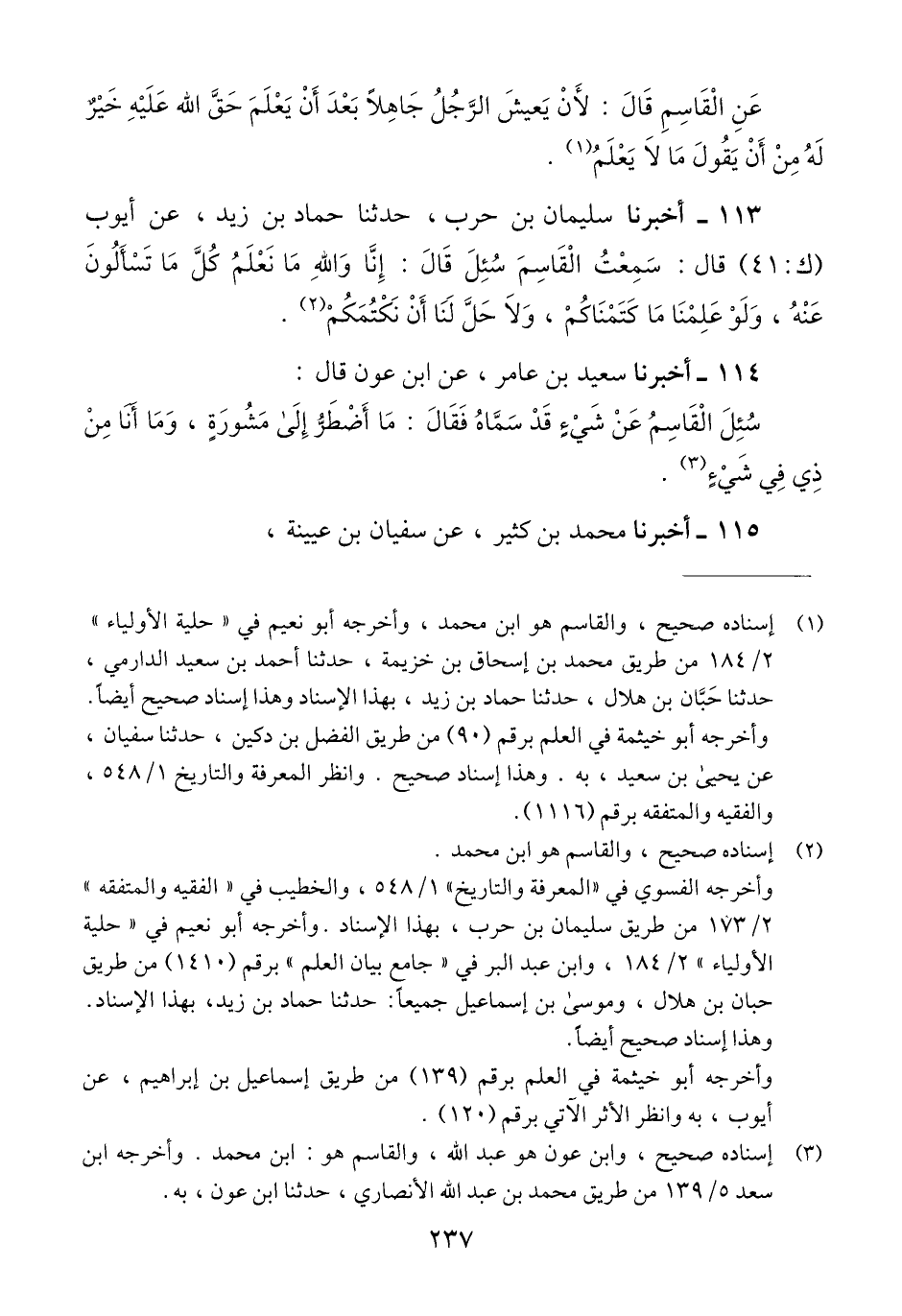 113 - أَخْبَرَنَا سُلَيْمَانُ بْنُ حَرْبٍ، حَدَّثَنَا حَمَّادُ بْنُ زَيْدٍ، عَنْ أَيُّوبَ، قَالَ: سَمِعْتُ الْقَاسِمَ، سْئلُ قَالَ: «§إِنَّا وَاللَّهِ مَا نَعْلَمُ كُلَّ مَا تَسْأَلُونَ عَنْهُ، وَلَوْ عَلِمْنَا مَا كَتَمْنَاكُمْ، وَلَا حَلَّ لَنَا أَنْ نَكْتُمَكُمْ» Qإسناده صحيح