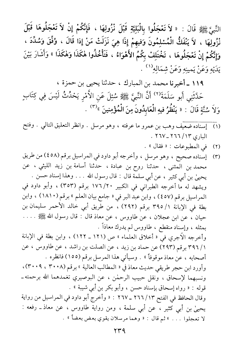 119 - أَخْبَرَنَا مُحَمَّدُ بْنُ الْمُبَارَكِ، حَدَّثَنَا يَحْيَى بْنُ حَمْزَةَ حَدَّثَنِي أَبُو سَلَمَةَ، أَنَّ النَّبِيَّ صَلَّى اللهُ عَلَيْهِ وَسَلَّمَ سُئِلَ عَنِ الْأَمْرِ يَحْدُثُ لَيْسَ فِي كِتَابٍ وَلَا سُنَّةٍ قَالَ: «§يَنْظُرُ فِيهِ الْعَابِدُونَ مِنَ الْمُؤْمِنِينَ» Qإسناده صحيح وهو مرسل