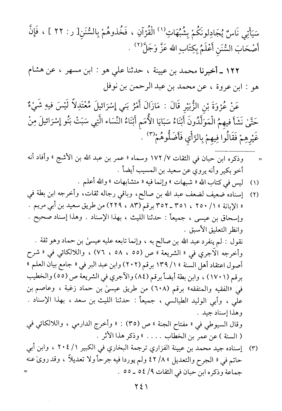 122 - أَخْبَرَنَا مُحَمَّدُ بْنُ عُيَيْنَةَ، حَدَّثَنَا عَلِيٌّ هُوَ ابْنُ مُسْهِرٍ، عَنْ هِشَامٍ هُوَ ابْنُ عُرْوَةَ، عَنْ مُحَمَّدِ بْنِ عَبْدِ الرَّحْمَنِ بْنِ نَوْفَلٍ، عَنْ عُرْوَةَ بْنِ الزُّبَيْرِ، قَالَ: «§مَا زَالَ أَمْرُ بَنِي إِسْرَائِيلَ مُعْتَدِلًا لَيْسَ فِيهِ شَيْءٌ حَتَّى نَشَأَ فِيهِمُ الْمُوَلَّدُونَ أَبْنَاءُ سَبَايَا الْأُمَمِ أَبْنَاءُ النِّسَاءِ الَّتِي سَبَتْ بَنُو إِسْرَائِيلَ مِنْ غَيْرِهِمْ فَقَالُوا فِيهِمْ بِالرَّأْيِ فَأَضَلُّوهُمْ» Qإسناده جيد