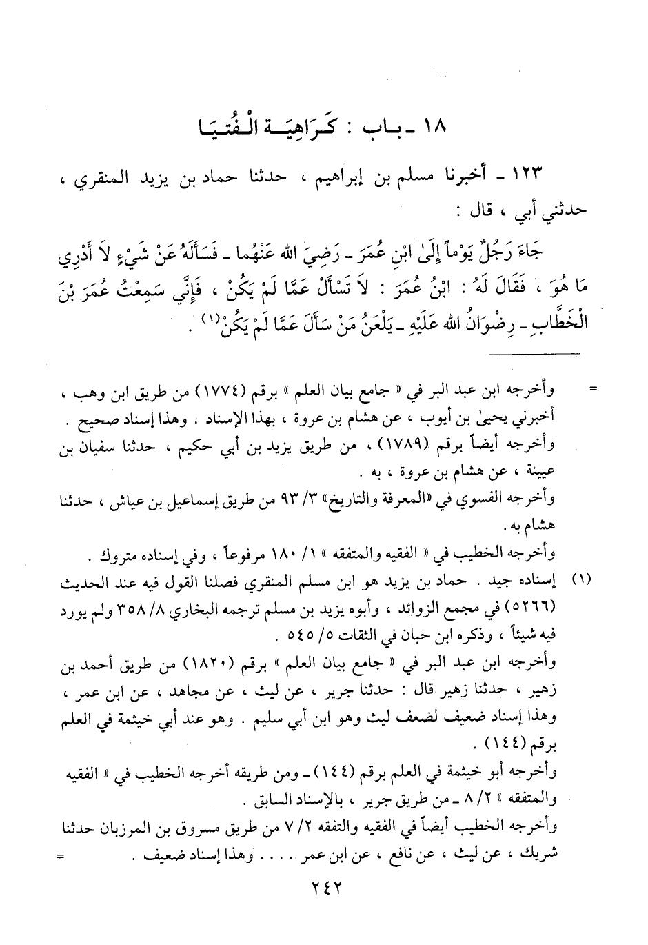 123 - أَخْبَرَنَا مُسْلِمُ بْنُ إِبْرَاهِيمَ، حَدَّثَنَا حَمَّادُ بْنُ يَزِيدَ الْمِنْقَرِيُّ، حَدَّثَنِي أَبِي، قَالَ: " جَاءَ رَجُلٌ يَوْمًا إِلَى ابْنِ عُمَرَ رَضِيَ اللَّهُ عَنْهُمَا، فَسَأَلَهُ عَنْ شَيْءٍ لَا أَدْرِي مَا هُوَ، فَقَالَ لَهُ: ابْنُ عُمَرَ: §لَا تَسْأَلْ عَمَّا لَمْ يَكُنْ، فَإِنِّي سَمِعْتُ عُمَرَ بْنَ الْخَطَّابِ رِضْوَانُ اللَّهِ عَلَيْهِ يَلْعَنُ مَنْ سَأَلَ عَمَّا لَمْ يَكُنْQإسناده جيد