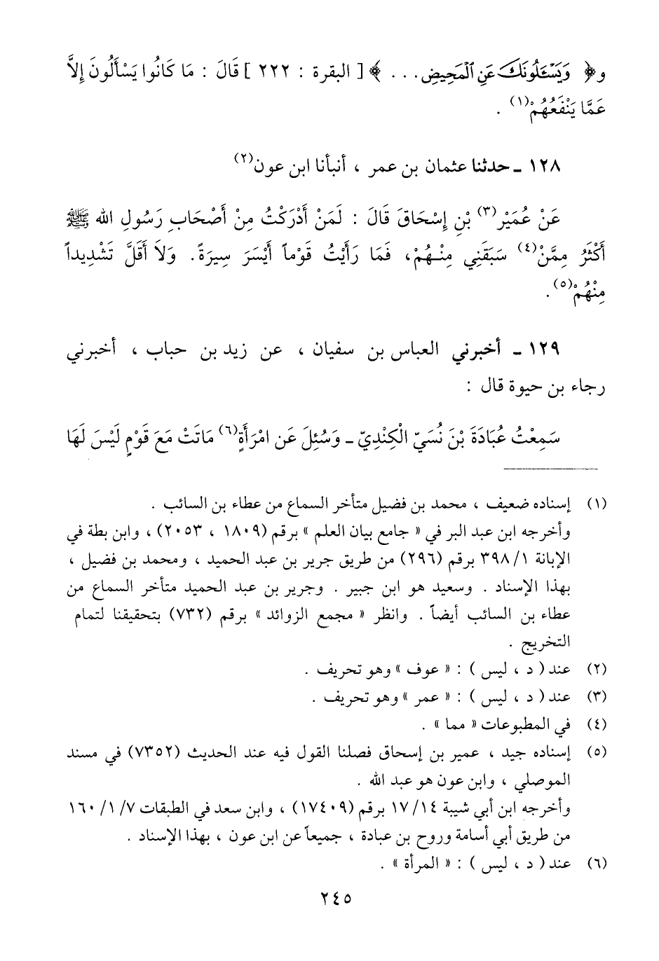 128 - حَدَّثَنَا عُثْمَانُ بْنُ عُمَرَ، أَنبَأَنَا ابْنُ عَوْنٍ، عَنْ عُمَيْرِ بْنِ إِسْحَاقَ، قَالَ: لَمَنْ «§أَدْرَكْتُ مِنْ أَصْحَابِ رَسُولِ اللَّهِ صَلَّى اللهُ عَلَيْهِ وَسَلَّمَ أَكْثَرُ مِمَّنْ سَبَقَنِي مِنْهُمْ، فَمَا رَأَيْتُ قَوْمًا أَيْسَرَ سِيرَةً، وَلَا أَقَلَّ تَشْدِيدًا مِنْهُمْ» Qإسناده جيد