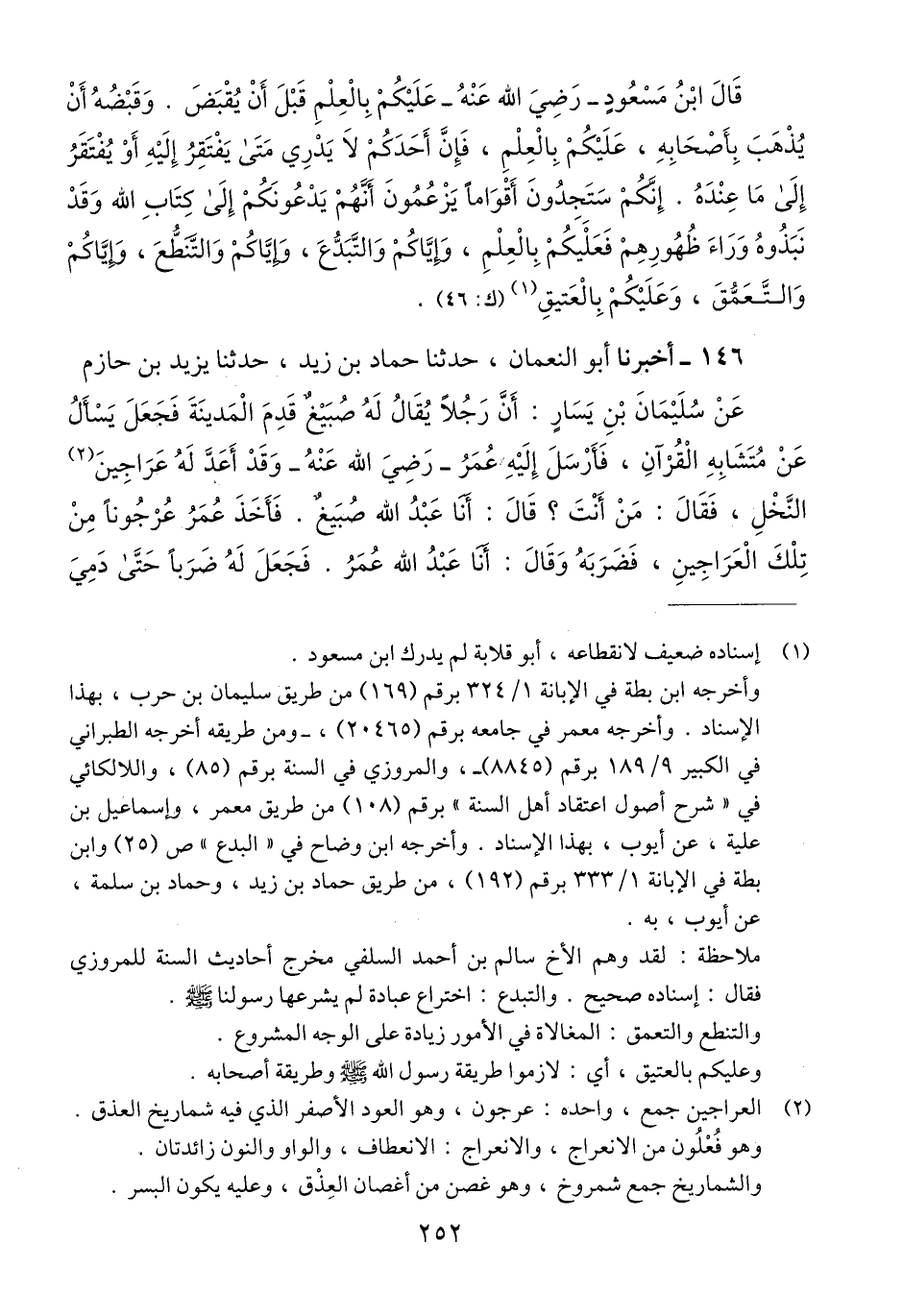 146 - أَخْبَرَنَا أَبُو النُّعْمَانِ، حَدَّثَنَا حَمَّادُ بْنُ زَيْدٍ، حَدَّثَنَا يَزِيدُ بْنُ حَازِمٍ، عَنْ سُلَيْمَانَ بْنِ يَسَارٍ: أَنَّ رَجُلًا يُقَالُ لَهُ صَبِيغٌ قَدِمَ الْمَدِينَةَ فَجَعَلَ يَسْأَلُ عَنْ مُتَشَابِهِ الْقُرْآنِ، فَأَرْسَلَ إِلَيْهِ عُمَرُ رَضِيَ اللَّهُ عَنْهُ وَقَدْ أَعَدَّ لَهُ عَرَاجِينَ النَّخْلِ، فَقَالَ: مَنْ أَنْتَ؟ قَالَ: أَنَا عَبْدُ اللَّهِ صَبِيغٌ، فَأَخَذَ عُمَرُ عُرْجُونًا مِنْ تِلْكَ الْعَرَاجِينِ، فَضَرَبَهُ وَقَالَ: أَنَا عَبْدُ اللَّهِ عُمَرُ، «§فَجَعَلَ لَهُ ضَرْبًا حَتَّى دَمِيَ -[253]- رَأْسُهُ،» فَقَالَ: يَا أَمِيرَ الْمُؤْمِنِينَ، حَسْبُكَ، قَدْ ذَهَبَ الَّذِي كُنْتُ أَجِدُ فِي رَأْسِيQرجاله ثقات غير أنه منقطع سليمان بن يسار لم يدرك عمر بن الخطاب