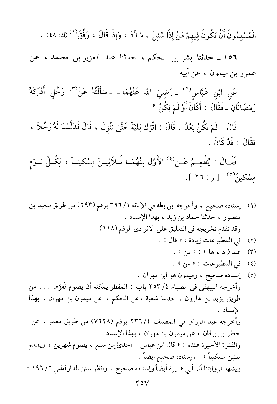 156 - حَدَّثَنَا بِشْرُ بْنُ الْحَكَمِ، حَدَّثَنَا عَبْدُ الْعَزِيزِ بْنُ مُحَمَّدٍ، عَنْ عَمْرِو بْنِ مَيْمُونٍ، عَنْ أَبِيهِ، عَنِ ابْنِ عَبَّاسٍ رَضِيَ اللَّهُ عَنْهُمَا، - سَأَلْتُهُ عَنْ رَجُلٍ أَدْرَكَهُ رَمَضَانَانِ - فَقَالَ: أَكَانَ أَوْ لَمْ يَكُنْ؟ قَالَ: لَمْ يَكُنْ بَعْدُ، قَالَ: «اتْرُكْ بَلِيَّتَهُ حَتَّى تَنْزِلَ»، قَالَ: فَدَلَّسْنَا لَهُ رَجُلًا، فَقَالَ: قَدْ كَانَ، فَقَالَ: §يُطْعِمُ عَنِ الْأَوَّلِ مِنْهُمَا ثَلَاثِينَ مِسْكِينًا، لِكُلِّ يَوْمٍ مِسْكِينٌQإسناده صحيح