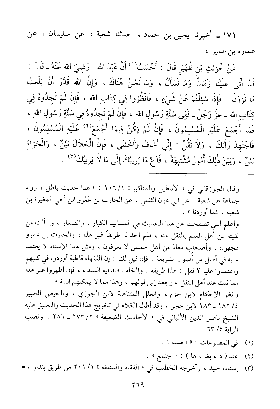 171 - أَخْبَرَنَا يَحْيَى بْنُ حَمَّادٍ، حَدَّثَنَا شُعْبَةُ، عَنْ سُلَيْمَانَ، عَنْ عُمَارَةَ بْنِ عُمَيْرٍ، عَنْ حُرَيْثِ بْنِ ظُهَيْرٍ، قَالَ: أَحْسَبُ أَنَّ عَبْدَ اللَّهِ رَضِيَ اللَّهُ عَنْهُ، قَالَ: " قَدْ أَتَى عَلَيْنَا زَمَانٌ وَمَا نُسْأَلُ، وَمَا نَحْنُ هُنَاكَ، وَإِنَّ اللَّهِ قَدَّرَ أَنْ بَلَغْتُ مَا تَرَوْنَ. §فَإِذَا سُئِلْتُمْ عَنْ شَيْءٍ، فَانْظُرُوا فِي كِتَابِ اللَّهِ، فَإِنْ لَمْ تَجِدُوهُ فِي كِتَابِ اللَّهِ عَزَّ وَجَلَّ فَفِي سُنَّةِ رَسُولِ اللَّهِ، فَإِنْ لَمْ تَجِدُوهُ فِي سُنَّةِ رَسُولِ اللَّهِ، فَمَا أَجْمَعَ عَلَيْهِ الْمُسْلِمُونَ، فَإِنْ لَمْ يَكُنْ فِيمَا أَجْمَعَ عَلَيْهِ الْمُسْلِمُونَ، فَاجْتَهِدْ رَأْيَكَ، وَلَا تَقُلْ: إِنِّي أَخَافُ وَأَخْشَى، فَإِنَّ الْحَلَالَ بَيِّنٌ، وَالْحَرَامَ بَيِّنٌ، وَبَيْنَ ذَلِكَ أُمُورٌ مُشْتَبِهَةٌ، فَدَعْ مَا يَرِيبُكَ إِلَى مَا لَا يَرِيبُكَ "