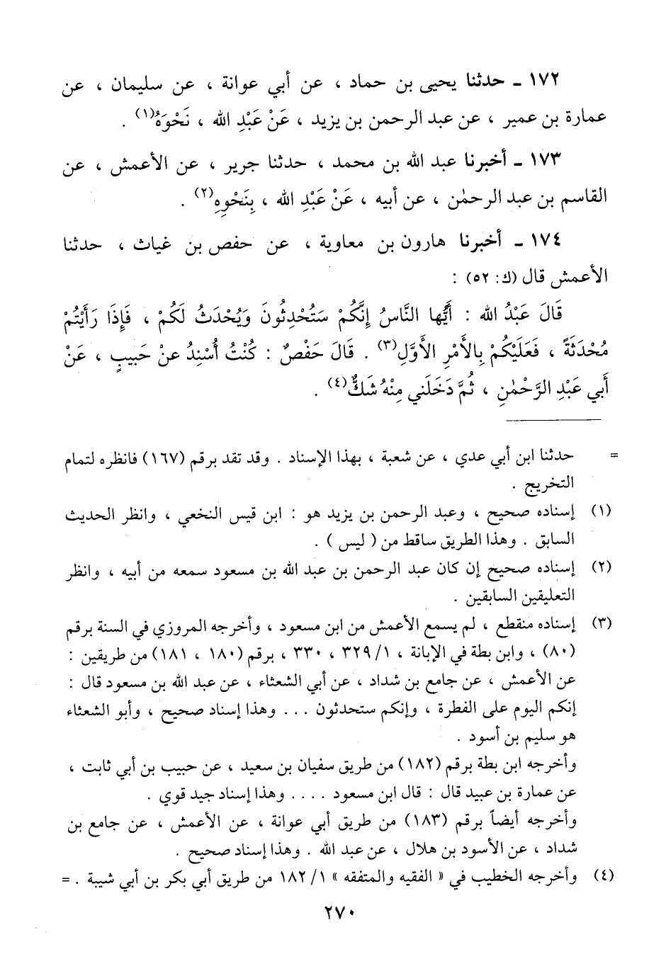 174 - أَخْبَرَنَا هَارُونُ بْنُ مُعَاوِيَةَ، عَنْ حَفْصِ بْنِ غِيَاثٍ، حَدَّثَنَا الْأَعْمَشُ، قَالَ: قَالَ عَبْدُ اللَّهِ: «أَيُّهَا النَّاسُ §إِنَّكُمْ سَتُحْدِثُونَ وَيُحْدَثُ لَكُمْ، فَإِذَا رَأَيْتُمْ مُحْدَثَةً، فَعَلَيْكُمْ بِالْأَمْرِ الْأَوَّلِ» قَالَ حَفْصٌ: كُنْتُ أُسْنِدُ عَنْ حَبِيبٍ، عَنْ أَبِي عَبْدِ الرَّحْمَنِ، ثُمَّ دَخَلَنِي مِنْهُ شَكٌّQإسناده منقطع لم يسمع الأعمش من ابن مسعود