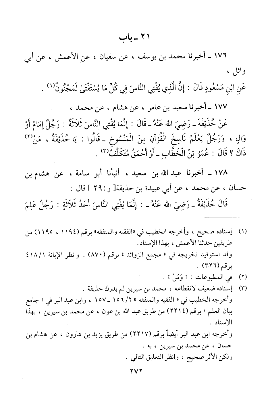 178 - أَخْبَرَنَا عَبْدُ اللَّهِ بْنُ سَعِيدٍ، أَنبَأَنَا أَبُو أُسَامَةَ، عَنْ هِشَامِ بْنِ حَسَّانَ، عَنْ مُحَمَّدٍ، عَنْ أَبِي عُبَيْدَةَ بْنِ حُذَيْفَةَ قَالَ: قَالَ حُذَيْفَةُ رَضِيَ اللَّهُ عَنْهُ: " §إِنَّمَا يُفْتِي النَّاسَ أَحَدُ ثَلَاثَةٍ: رَجُلٌ عَلِمَ -[273]- نَاسِخَ الْقُرْآنِ مِنْ مَنْسُوخِهِ، " قَالُوا: وَمَنْ ذَاكَ؟ قَالَ: عُمَرُ بْنُ الْخَطَّابِ - قَالَ: «وَأَمِيرٌ لَا يَجِدُ بُدًّا، أَوْ أَحْمَقُ مُتَكَلِّفٌ» ثُمَّ قَالَ مُحَمَّدٌ: فَلَسْتُ بِوَاحِدٍ مِنْ هَذَيْنِ، وَأَرْجُو أَنْ لَا أَكُونَ الثَّالِثَ