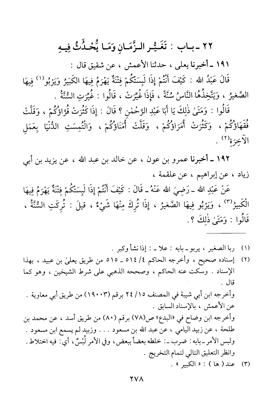 191 - أَخْبَرَنَا يَعْلَى، حَدَّثَنَا الْأَعْمَشُ، عَنْ شَقِيقٍ، قَالَ: قَالَ عَبْدُ اللَّهِ: " كَيْفَ أَنْتُمْ إِذَا لَبِسَتْكُمْ فِتْنَةٌ يَهْرَمُ فِيهَا الْكَبِيرُ، وَيَرْبُو فِيهَا الصَّغِيرُ، وَيَتَّخِذُهَا النَّاسُ سُنَّةً، فَإِذَا غُيِّرَتْ قَالُوا: غُيِّرَتِ السُّنَّةُ ". قَالُوا: وَمَتَى ذَلِكَ يَا أَبَا عَبْدِ الرَّحْمَنِ؟ قَالَ: «§إِذَا كَثُرَتْ قُرَّاؤُكُمْ، وَقَلَّتْ فُقَهَاؤُكُمْ، وَكَثُرَتْ أُمَرَاؤُكُمْ، وَقَلَّتْ أُمَنَاؤُكُمْ، وَالْتُمِسَتِ الدُّنْيَا بِعَمَلِ الْآخِرَةِ» Qإسناده صحيح