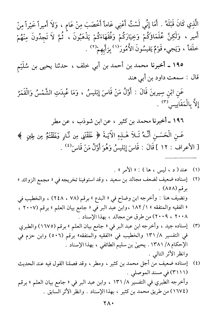 195 - أَخْبَرَنَا مُحَمَّدُ بْنُ أَحْمَدَ بْنِ أَبِي خَلَفٍ، حَدَّثَنَا يَحْيَى بْنُ سُلَيْمٍ، قَالَ: سَمِعْتُ دَاوُدَ بْنَ أَبِي هِنْدٍ، عَنِ ابْنِ سِيرِينَ قَالَ: «§أَوَّلُ مَنْ قَاسَ إِبْلِيسُ، وَمَا عُبِدَتِ الشَّمْسُ وَالْقَمَرُ إِلَّا بِالْمَقَايِيسِ» Qإسناده جيد